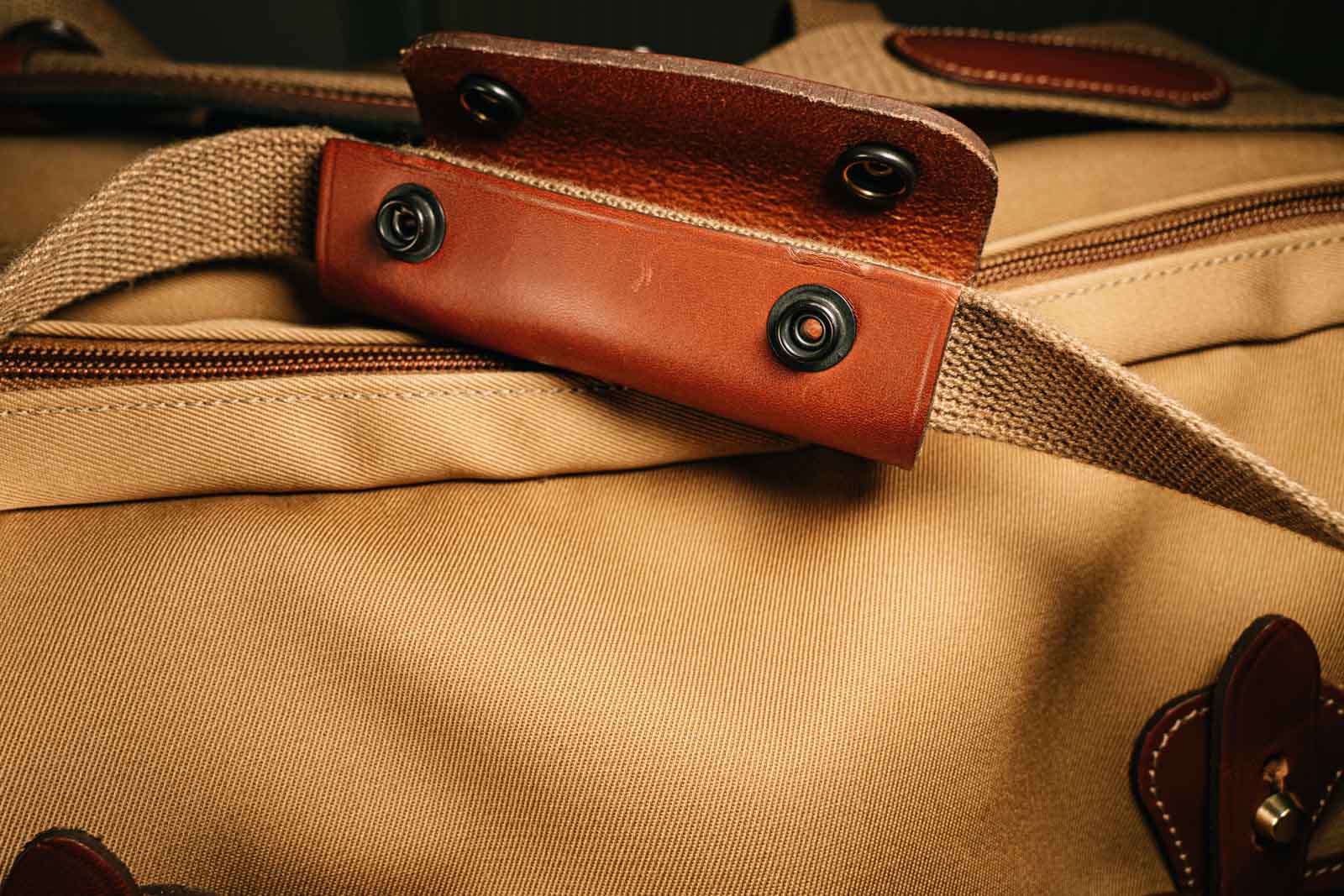 In Momenten, in denen man die Tasche nicht über der Schulter tragen will, gibt es einen sehr schönen Ledergriff, der bei der 5er Reihe gleichzeitig der Hauptverschluss der Tasche ist. Sehr hochwertige und starke Druckknöpfe sichern den Verschluss. Diese Verschlussart ist nur bei der 5er und der 550 der Fall. Alle anderen Billinghams werden über die Lederriemen an der Frontseite mit dem, wie ich finde, genial und schnellem Verschlusssystem verschlossen.