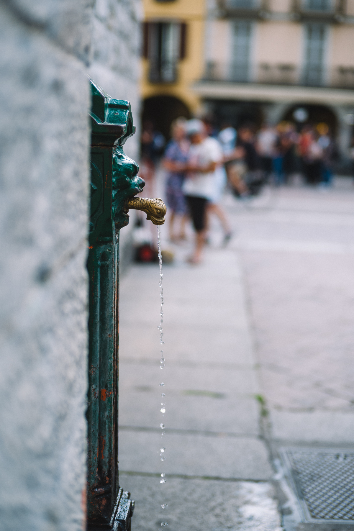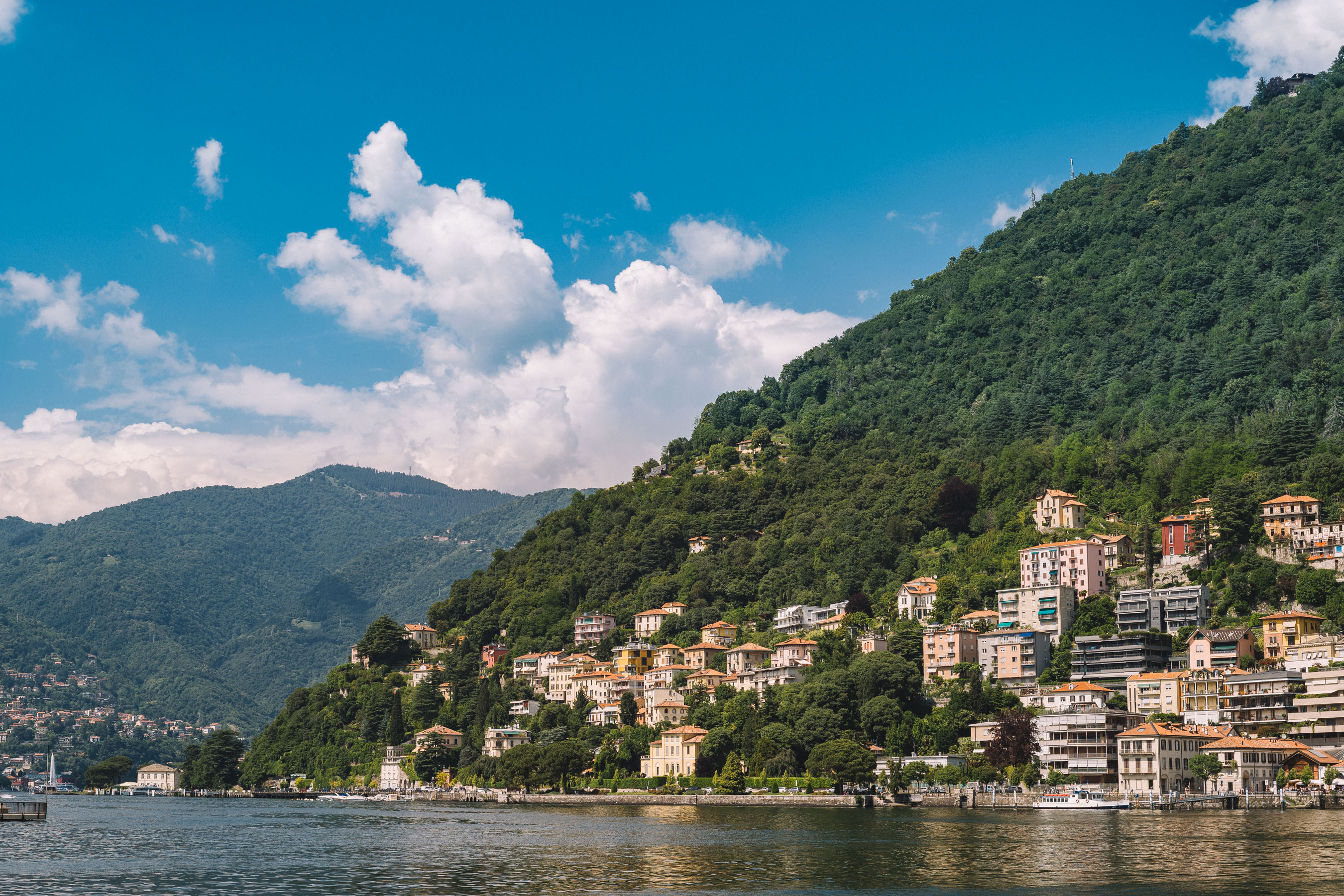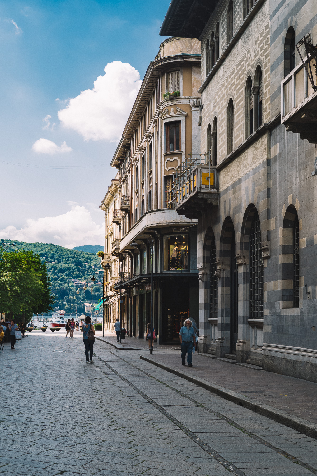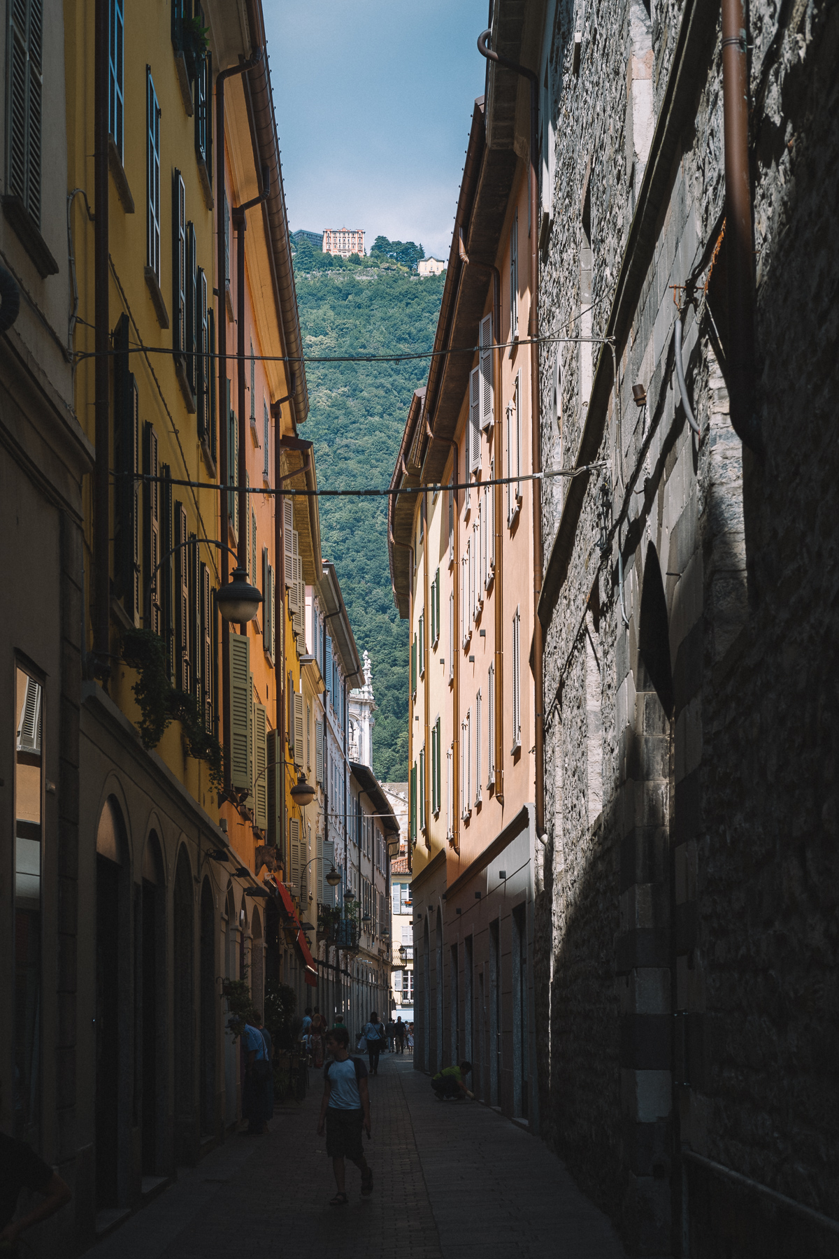 Ich hatte mal wieder nur wenig Zeit und versuchte so viel wie möglich aus meinem kurzen 3-stündigen Ausflug herauszuholen. Mein Hotel war in Saronno, welches mit der Bahn ziemlich genau 40 Minuten von Como entfernt liegt. Die Anreise war unkompliziert und mit 2,80 Euro pro Fahrt erschwinglich. Steigt man an der Endhaltestelle aus und geht 2 Minuten weiter, befindet man sich sofort vor der schönen Kulisse des Comer Sees. Die vielen Häuser in den Bergen, welche den See umzingeln, hinterlassen schon einen bleibenden Eindruck. Ich stelle mir das abends zur blauen Stunde, wenn die Lichter in/an den Häusern angehen, besonders schön vor. Ich hatte leider nicht die Möglichkeit, so lange zu warten, zumindest nicht, wenn ich noch ein wenig Schlaf erhaschen wollte, bevor um 3 Uhr morgens dann der Wecker klingeln sollte. Es war recht warm an dem Tag, was das Schlendern durch die vielen kleinen Gassen umso angenehmer machte. Durch die sehr enge Bauweise der Häuser ist es dort glücklicherweise recht schattig und dadurch natürlich auch trotz 30 Grad in der Stadt gut auszuhalten.