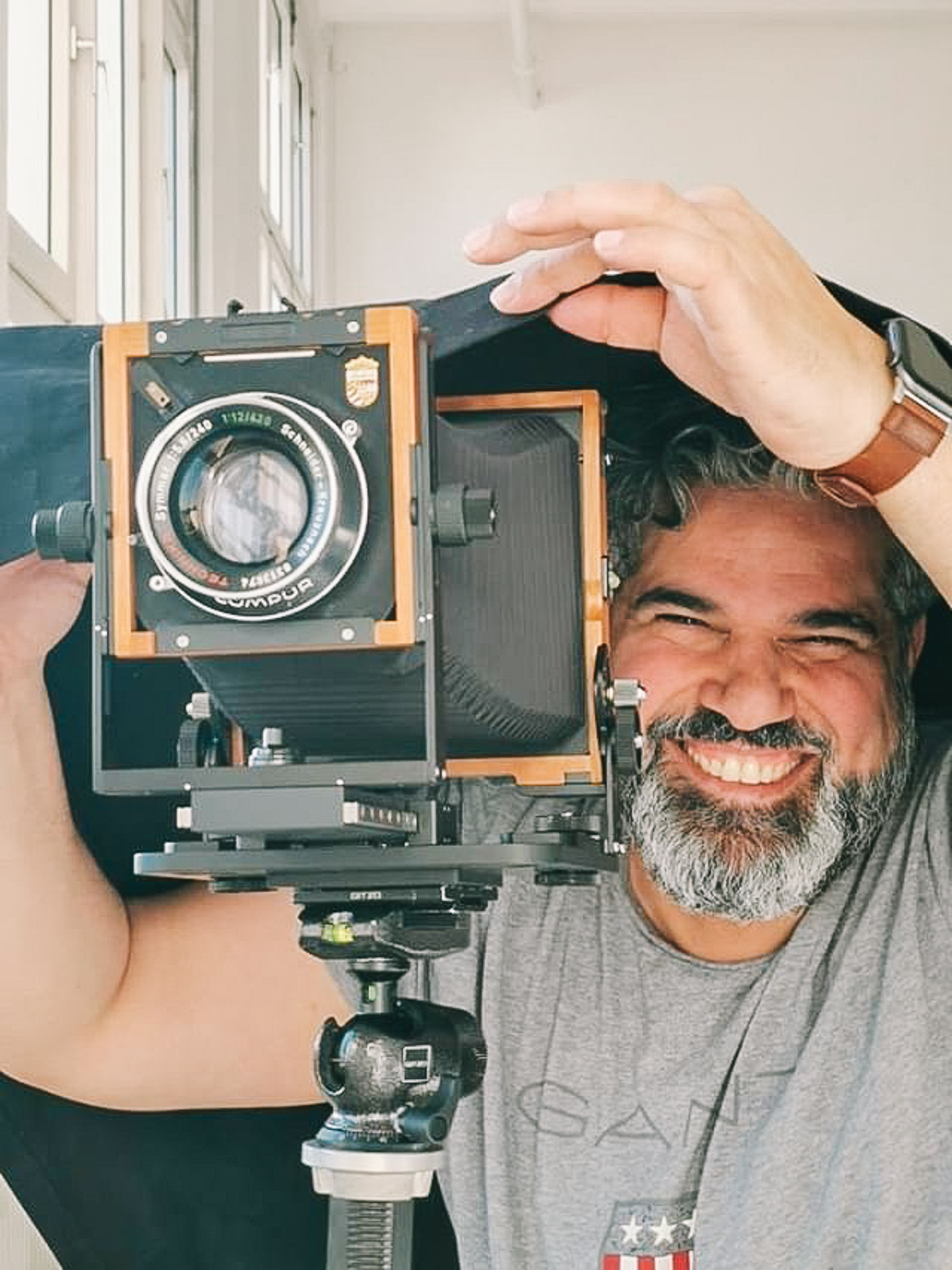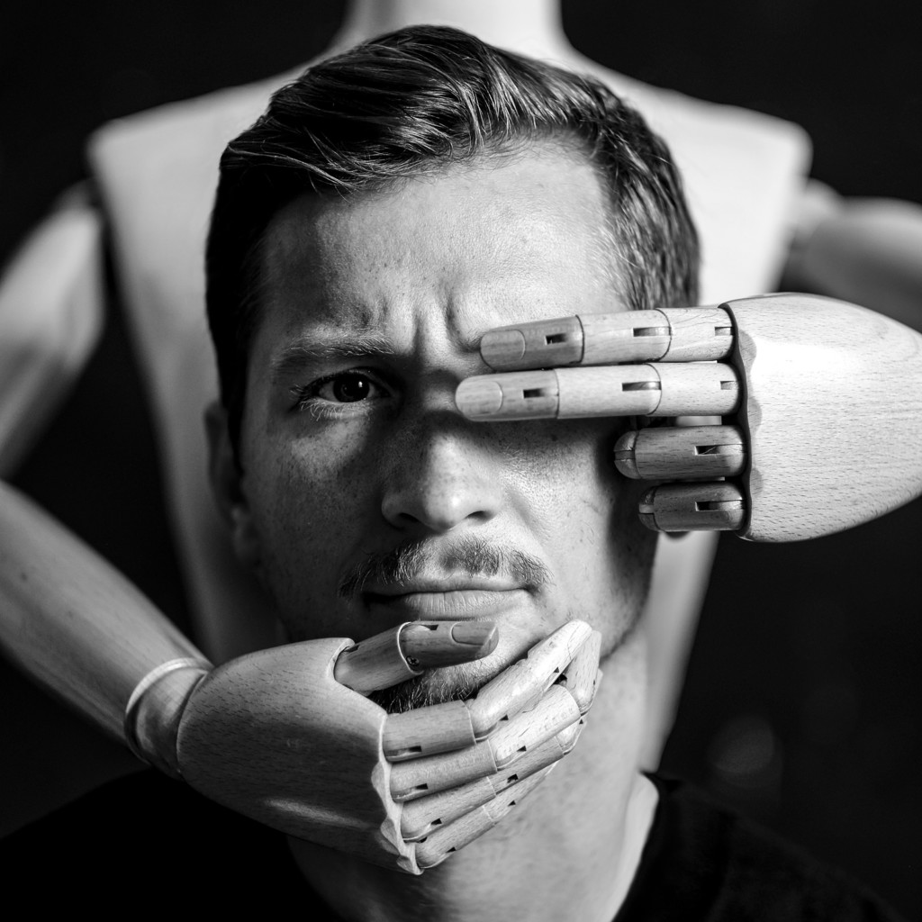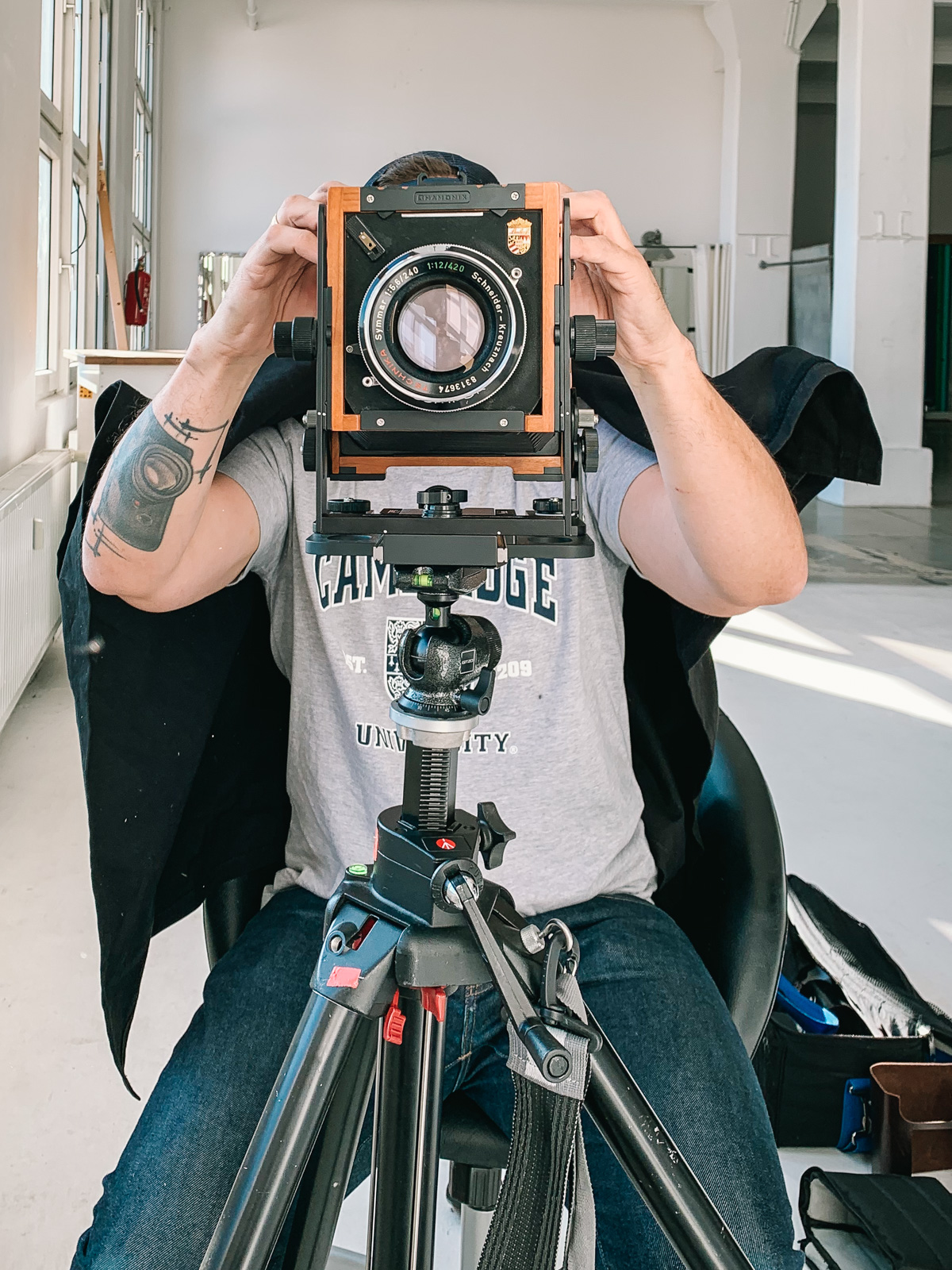 Neulich besuchte ich Tobias in seinem Studio in Berlin, um mir einen Tobias Schult abzuholen und die Contax G2 aus dem Titelbild, die mir Tobias freundlicherweise leihweise überlässt. Ich hatte auf Instagram seine Aufnahmen mit der Chamonix Kamera mit dem Fujifilm FP100 (affiliate link) immer aufmerksam verfolgt. Vor allem, weil ich noch nie mit einer Großformatkamera gearbeitet hatte. Der Film wurde leider von Fujifilm offiziell eingestellt und die Restbestände gehen jetzt für wirklich horrende Preise über den Ladentisch. Als ich da so saß und von Tobias für die Aufnahme ins rechte Licht gerückt wurde, muss er wohl irgendwann verzweifelt sein. Denn natürlich interessierte es mich brennend, wie er da alles einstellte. Und da er mit einem 240mm bei f5.6 an einer Großformatkamera ca. 1 Meter von mir entfernt rumhantierte, war die Schärfeebene natürlich minimal. Er leitete mich an, wie ich meinen Kopf zu halten hatte, und als er dann alles einstellen wollte, war ich natürlich wieder wie ein neugieriges Kind am schauen und komplett aus der Position raus.