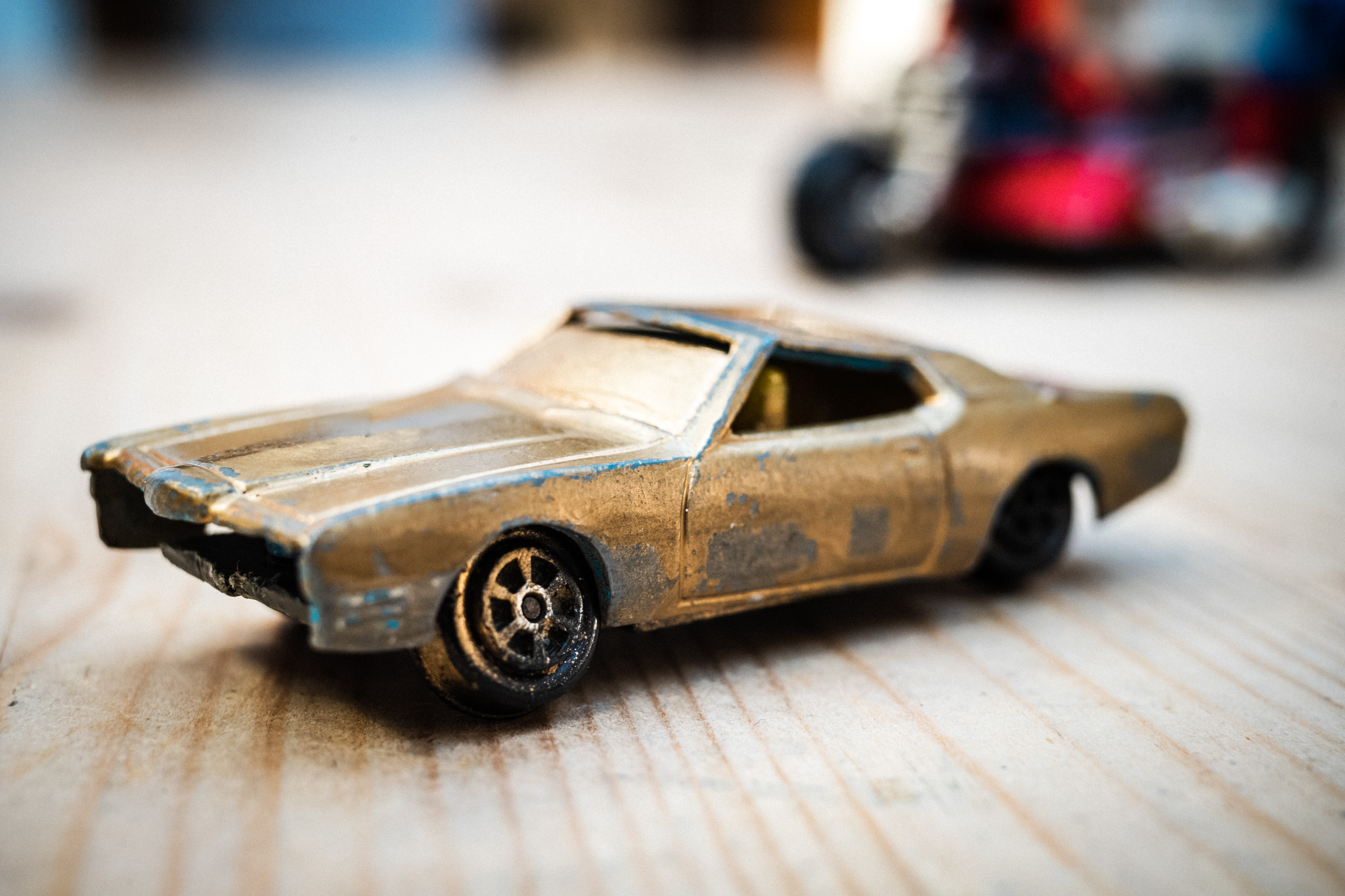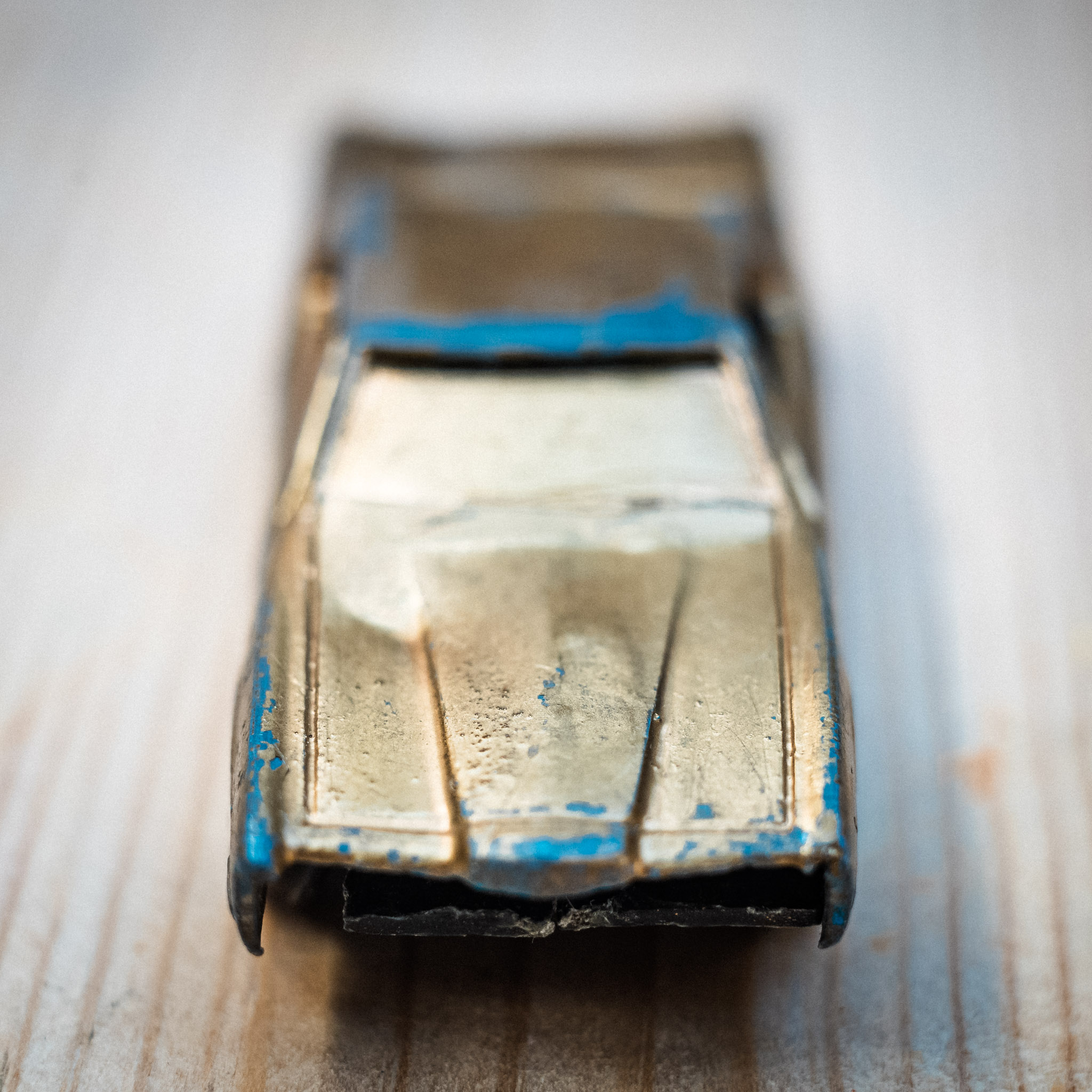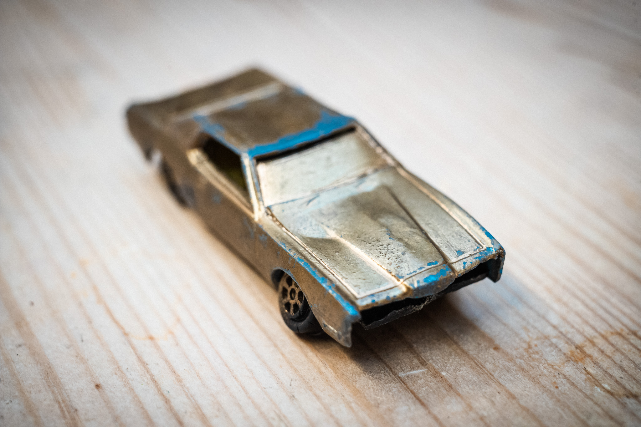 Tatsächlich stürtzte ich mich auch sofort auf den Koffer. Meine kleine Tochter war genauso fasziniert von dem Koffer, als sie von meinen Eltern erfuhr, was es damit auf sich hatte. Sie wollte ihn natürlich sofort inspizieren, aber hier galt das Recht des Stärkeren. Erst als ich ihn fand, überließ ich ihr den Rest. Gleichzeitig mit dem Finden des Autos kam aber auch wieder diese Wut über mich selbst. Denn ich weiß bis heute nicht, was das für ein Auto ist, aber es war und ist das coolste Spielzeugauto, das es jemals (für mich) gab. Soviel steht fest. Na und ich Trottel habe dann seinerzeit in meiner Edding-Phase gedacht, es wäre cool, das Auto mit goldener Farbe anzumalen. Hätte ich wenigstens die doofen Scheiben ausgelassen. Dabei hatte das Auto so eine geile Patina… Die ursprüngliche Farbe war ein helleres Blau, welches schon abblätterte, wodurch das geile abgefuckte Metall darunter hervortrat. Obendrein hatte es auch schon mal Bekanntschaft mit einem Hammer gemacht, denn es war schließlich mein obercooles Bad Boy-Gangster-Auto. Selbst jetzt, wo ich hier darüber schreibe, ärgere ich mich noch, dass ich den Look des Autos zerstört habe. Gleichzeitig sehe ich mich auf dem Boden meines Kinderzimmers sitzen und harte Bullitt Szenen nachstellen, glücklich und zufrieden. Das Kind in mir wieder hervorholend schaue ich mir das Auto wieder an, drehe die Räder und, ja, lass es auch mal kurz in einem unbeobachteten Moment am Boden sitzend wieder seine waghalsigen Runden drehen.