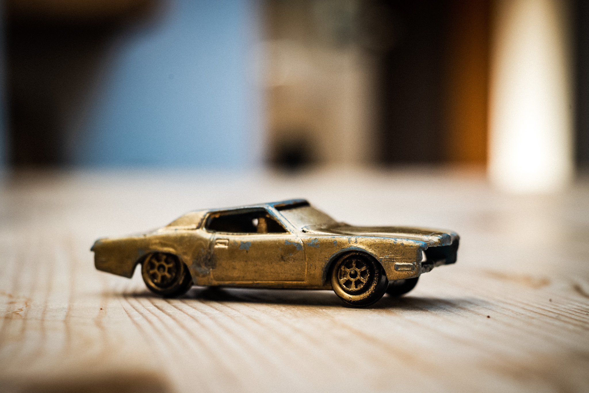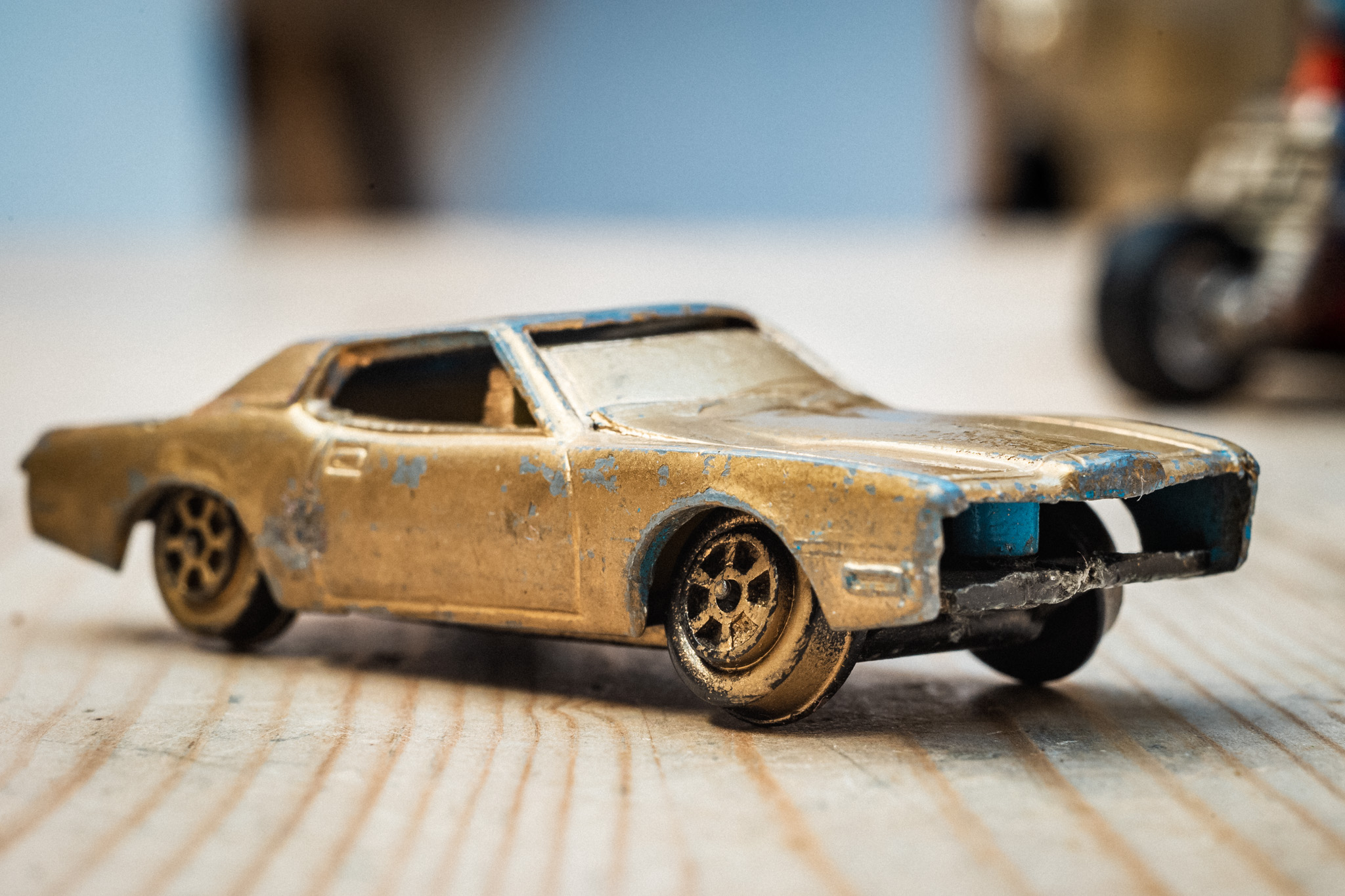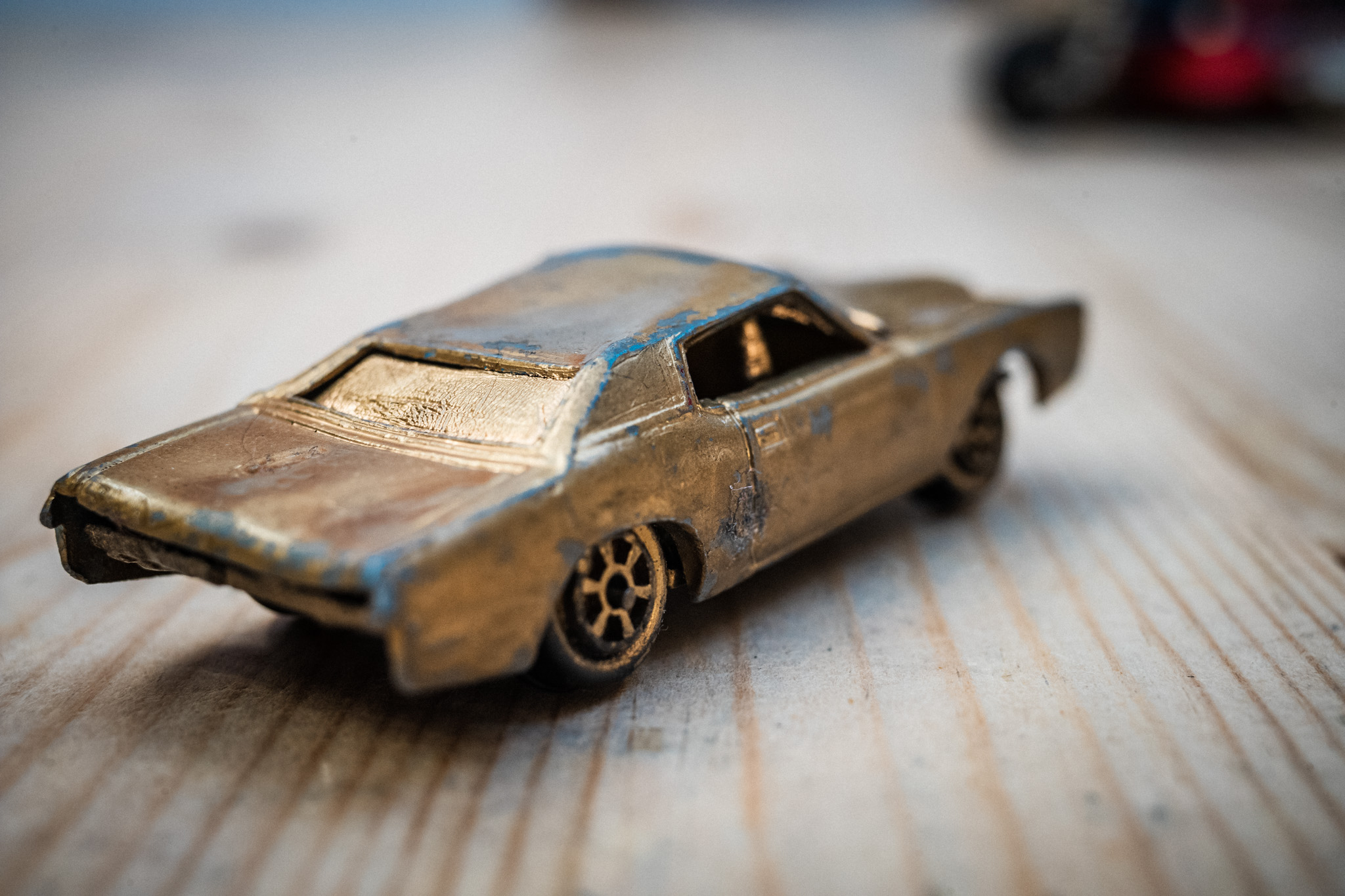 Tatsächlich stürtzte ich mich auch sofort auf den Koffer. Meine kleine Tochter war genauso fasziniert von dem Koffer, als sie von meinen Eltern erfuhr, was es damit auf sich hatte. Sie wollte ihn natürlich sofort inspizieren, aber hier galt das Recht des Stärkeren. Erst als ich ihn fand, überließ ich ihr den Rest. Gleichzeitig mit dem Finden des Autos kam aber auch wieder diese Wut über mich selbst. Denn ich weiß bis heute nicht, was das für ein Auto ist, aber es war und ist das coolste Spielzeugauto, das es jemals (für mich) gab. Soviel steht fest. Na und ich Trottel habe dann seinerzeit in meiner Edding-Phase gedacht, es wäre cool, das Auto mit goldener Farbe anzumalen. Hätte ich wenigstens die doofen Scheiben ausgelassen. Dabei hatte das Auto so eine geile Patina… Die ursprüngliche Farbe war ein helleres Blau, welches schon abblätterte, wodurch das geile abgefuckte Metall darunter hervortrat. Obendrein hatte es auch schon mal Bekanntschaft mit einem Hammer gemacht, denn es war schließlich mein obercooles Bad Boy-Gangster-Auto. Selbst jetzt, wo ich hier darüber schreibe, ärgere ich mich noch, dass ich den Look des Autos zerstört habe. Gleichzeitig sehe ich mich auf dem Boden meines Kinderzimmers sitzen und harte Bullitt Szenen nachstellen, glücklich und zufrieden. Das Kind in mir wieder hervorholend schaue ich mir das Auto wieder an, drehe die Räder und, ja, lass es auch mal kurz in einem unbeobachteten Moment am Boden sitzend wieder seine waghalsigen Runden drehen.