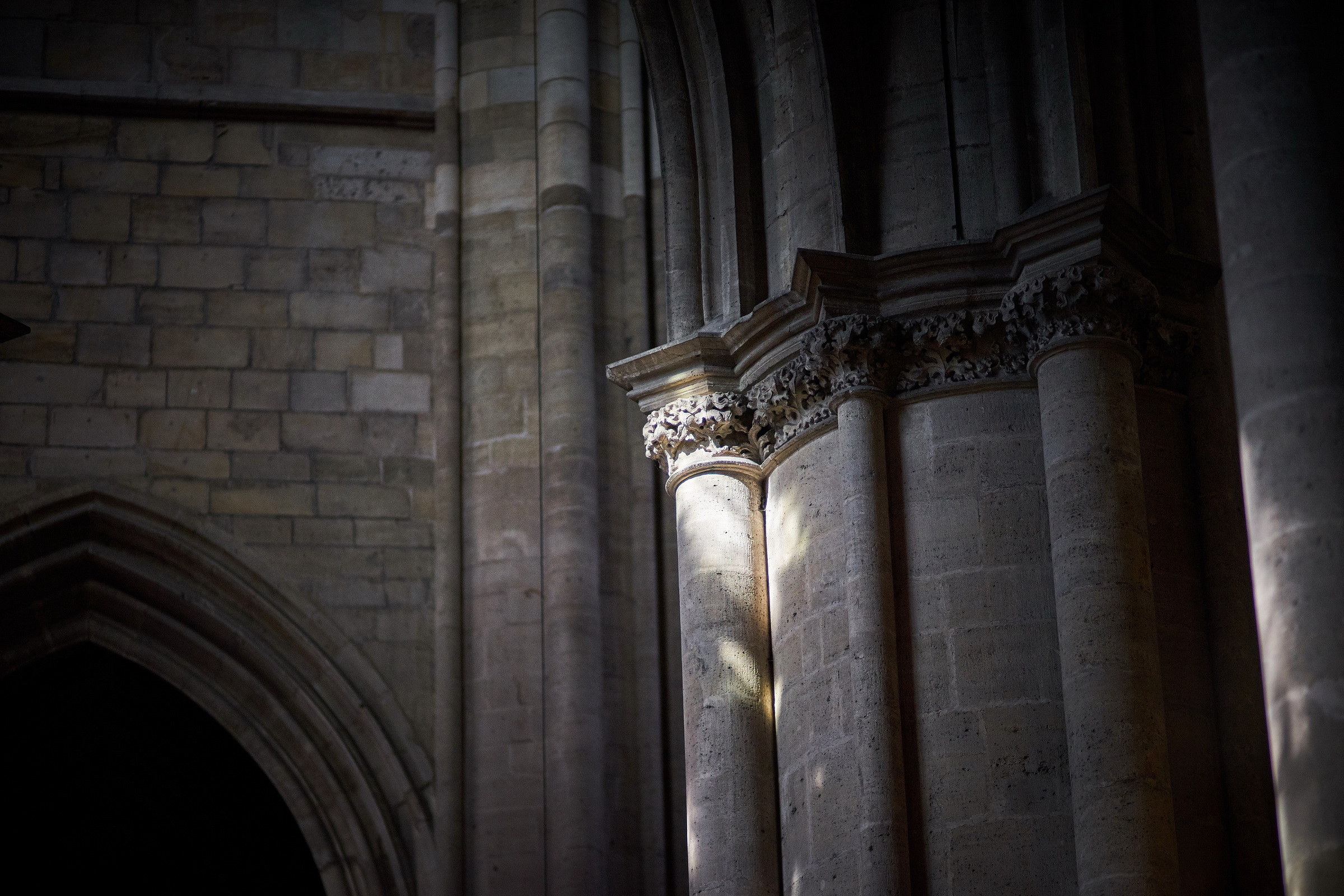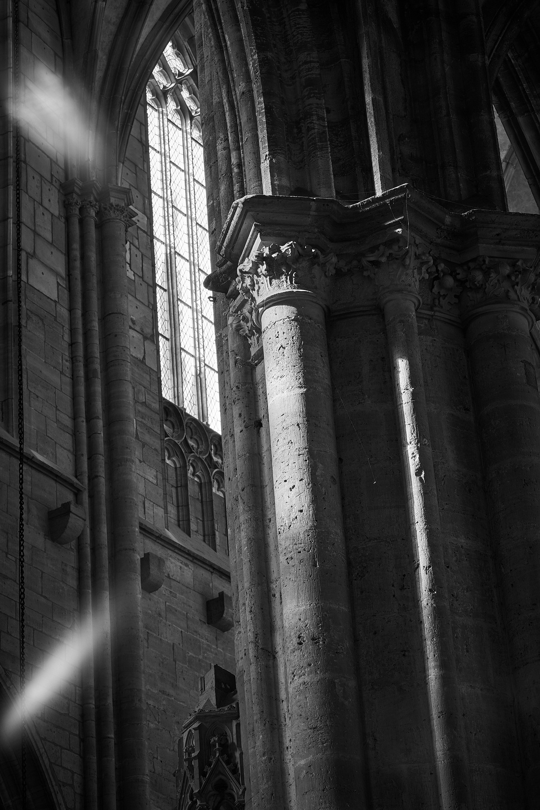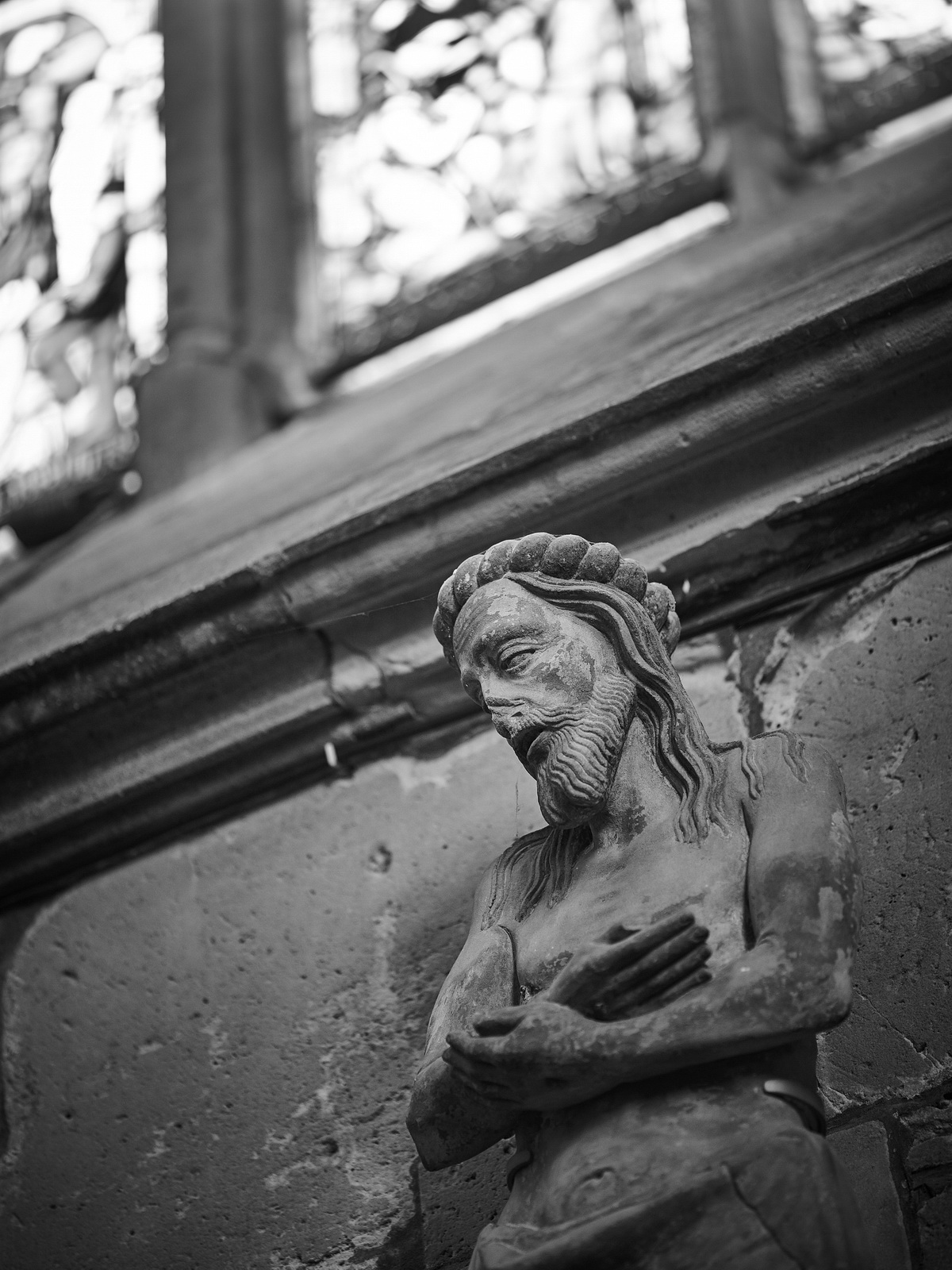Ist erstmal das Stativ eingerichtet, wird die Belichtung festgelegt- ganz in Ruhe kann man abwägen, welche Tiefe die Schärfe haben muss und wie lange ich dafür belichten muss. Ist das geklärt, kann es ja fast losgehen. Fokuspunkt, Komposition und Belichtung stimmen nun und ich kann auslösen. Die Kamera sucht plötzlich im Halbdunkel der alten Kirche nach dem Fokus. Anderthalb Sekunden Geratter und letztlich hört man den Verschluss. Es belichtet volle dreißig Sekunden und danach, endlich, kann man sich das Ergebnis anschauen. Mist! Unscharf. Alles nochmal. Auslösen, rattern, warten. Muss ja nicht sein.