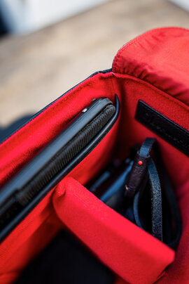 Das rote Innenfutter ist nicht nur Geschmackssache, sondern funktional extrem sinnvoll: Schwarzes Equipment hebt sich deutlich ab, man findet alles schneller. Gerade bei viel Inhalt ein echter Vorteil.