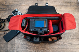 Selbst ein Sigma 28–45mm f/1.8 (lang, schwer, alles andere als kompakt) lässt sich problemlos unterbringen. Das ist keine Selbstverständlichkeit und auf den Bildern klar zu sehen.