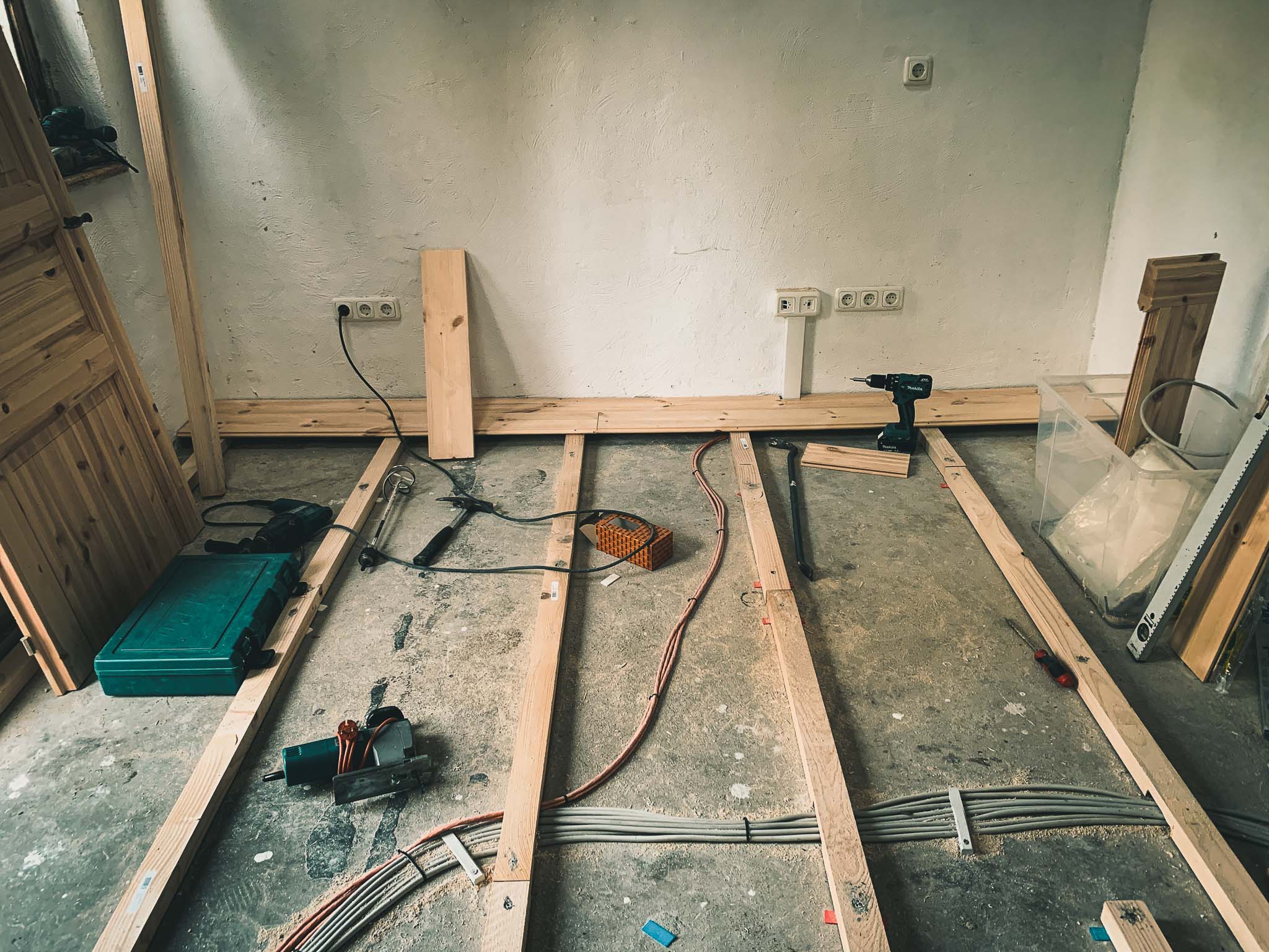 Damit man sofort erkennt, was dort entsteht, habe ich statt eines Baustellenschildes gleich mal die Leica Beleuchtung installiert (siehe Foto weiter unten). Ich konnte quasi durch Anschalten der Außenwelt signalisieren, dass gerade die Bauarbeiten in vollem Gange waren ?. Nachdem also der Raum entkernt, verputzt und dachseitig mit 2 Dachflächenfenstern bestückt und fertig war, ging es an den Ausbau. Diesen hatte ich vor meinem geistigen Auge schon fertig. Wie auch im restlichen Haus, war klar, dass der Fussboden aus Holzdielen bestehen sollte. Darunter habe ich die komplette Strom- und Netzwerkverkabelung verschwinden lassen. Bisschen Resteverwertung was Dämmung aus dem Dach anging drunter und fertig war der traumhafte Boden.