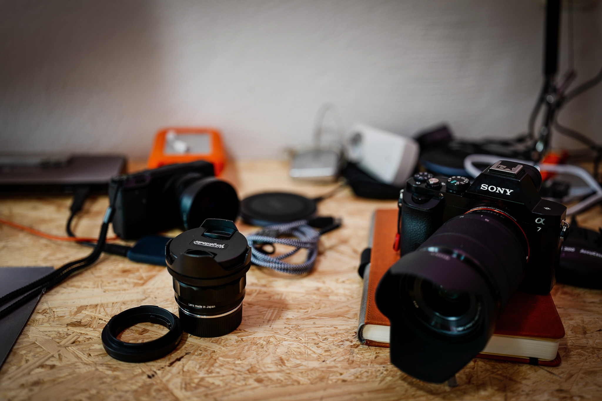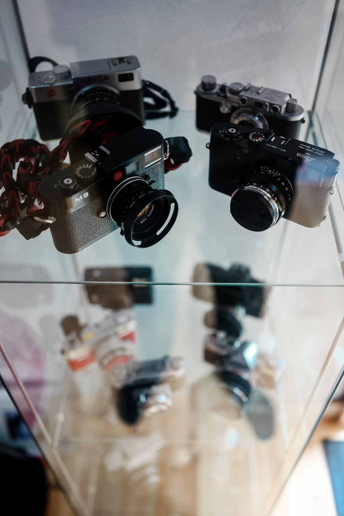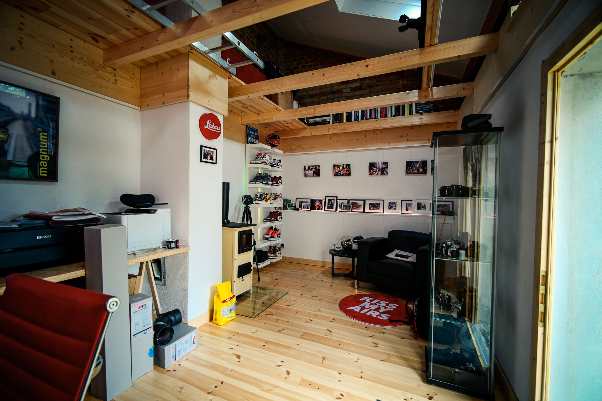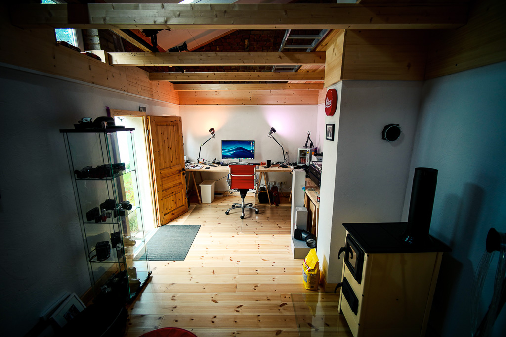 Aus lackierten OSB-Platten habe ich mir einen sehr großen Eckschreibtsich gebaut, der auf Holzböcken aus dem Baumarkt thront. Günstig und sieht passend aus, finde ich. Meine Armada an Fotobüchern und Bildbänden hat ebenfalls einen schönen Platz bekommen. Eine Glasvitrine beherbergt meine Sammlung an Kameras. Einige funktionieren nicht mehr aber mit vielen kann man sicherlich sogar noch fotografieren.