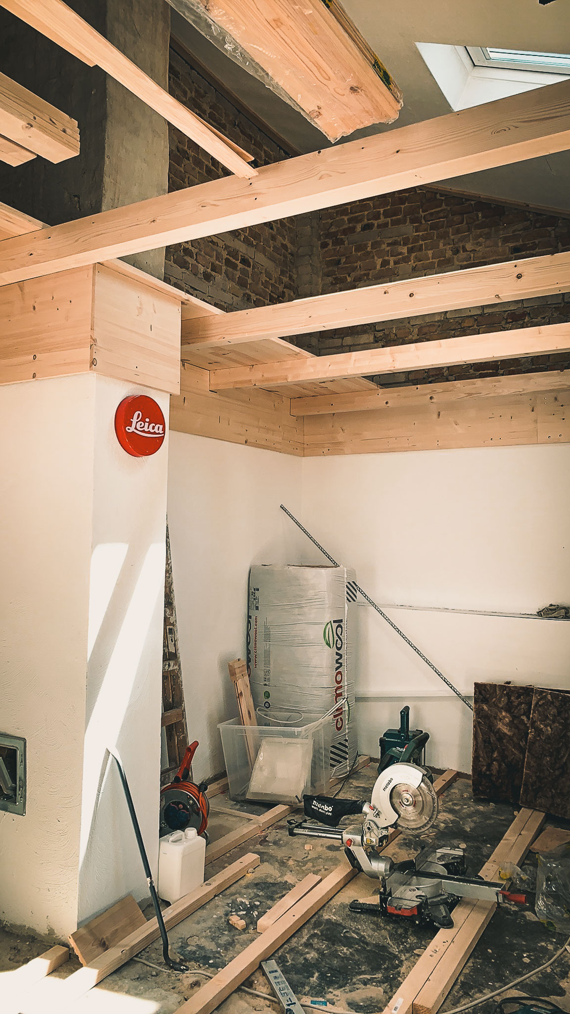 Direkt als ich ihn bei der Hausbesichtigung sah, was klar, dass aus dem kleinen Anbau direkt neben meinem Haus mein Rückzugsort, eine Art Fotostudio wird. Fotostudio klingt immer so gewerbsmäßig, denn eigentlich ist die Fotografie ja nur mein Hobby. Egal. Aus dem alten verdreckten Schuppen, der jahrelang nur Müll beherbergte, wurden Decken und Innenwände entfernt, Elektrokabel verlegt, Wände verputzt und neue Holzbalken eingezogen. Das dauerte ungefähr vom letzten Jahr August bis zum Ende des Winters dieses Jahr. Dank befreundeter Handwerker und jeder Menge Eigenleistung zog sich das leider – manchmal sehr zu meinem Mißfallen – in die Länge.