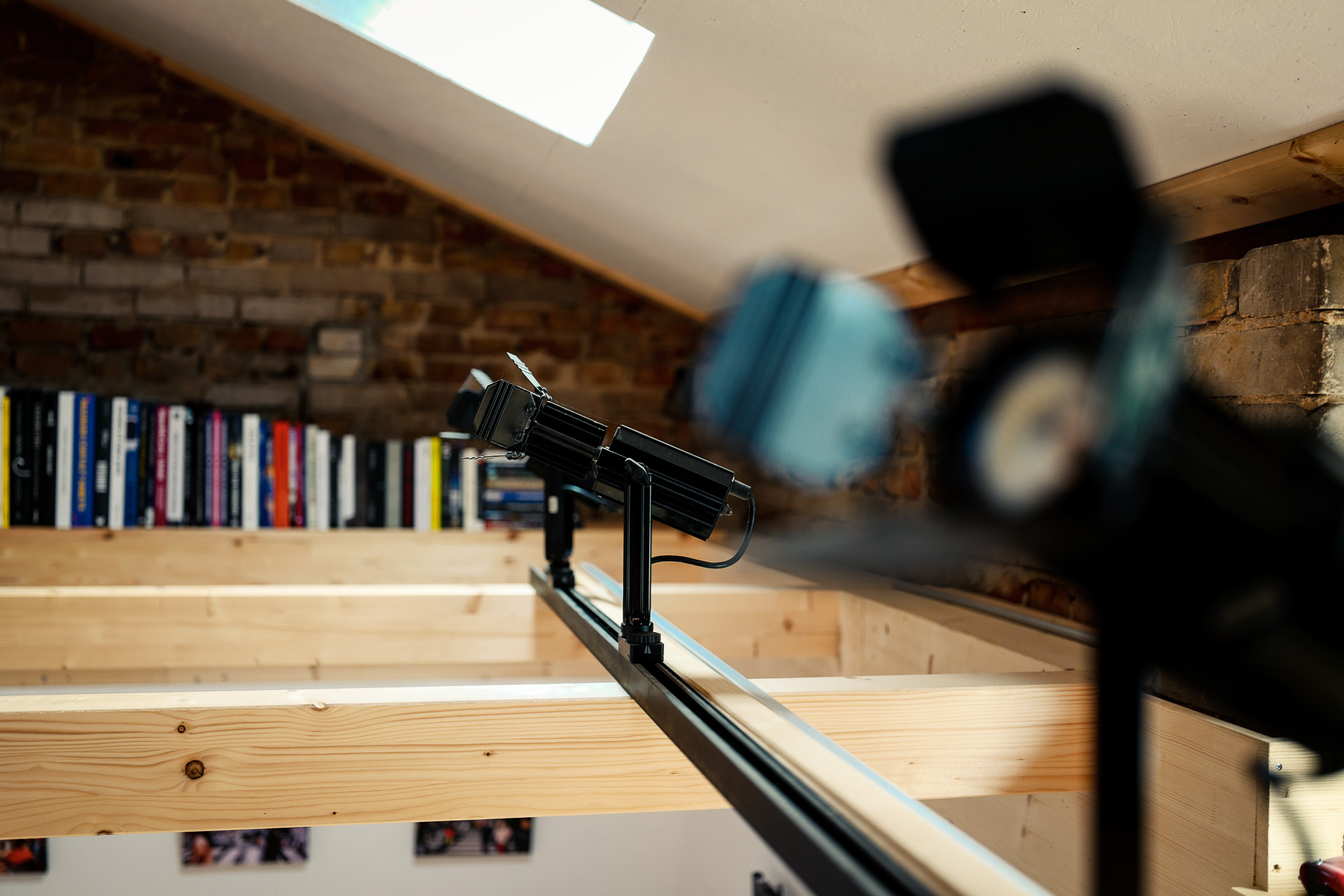 So ein Raum muss ja auch ordentlich beleuchtet sein. Also kamen meine alten Kinostrahler wieder zum Einsatz, die nun auf den Balken montiert sind und den oberen Bereich ausleuchten. Im unteren Bereich kann ich die hintere Vorsatzwand durch eine Plexiglasabdeckung und die Schreibtischlampen mittels Handy beleuchten und steuern. Bin halt ein Mann, kann also nix dafür ?.
