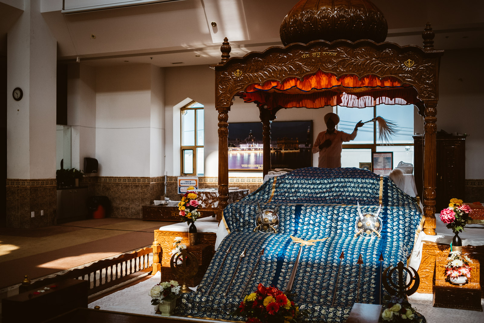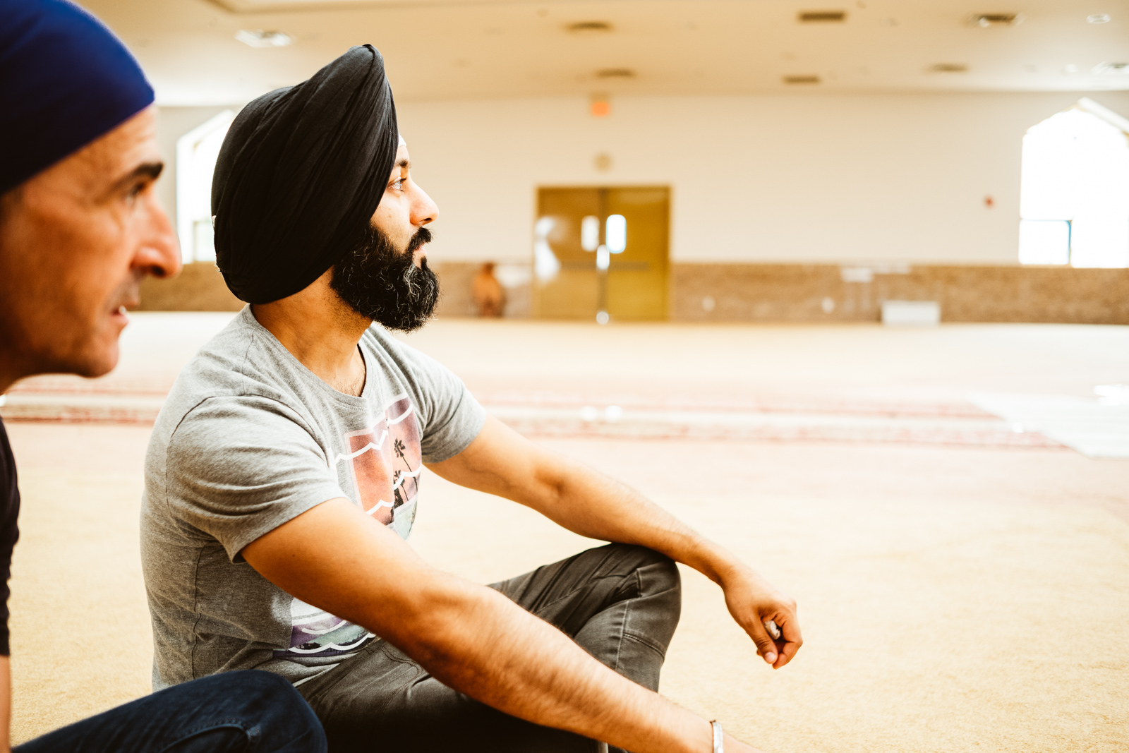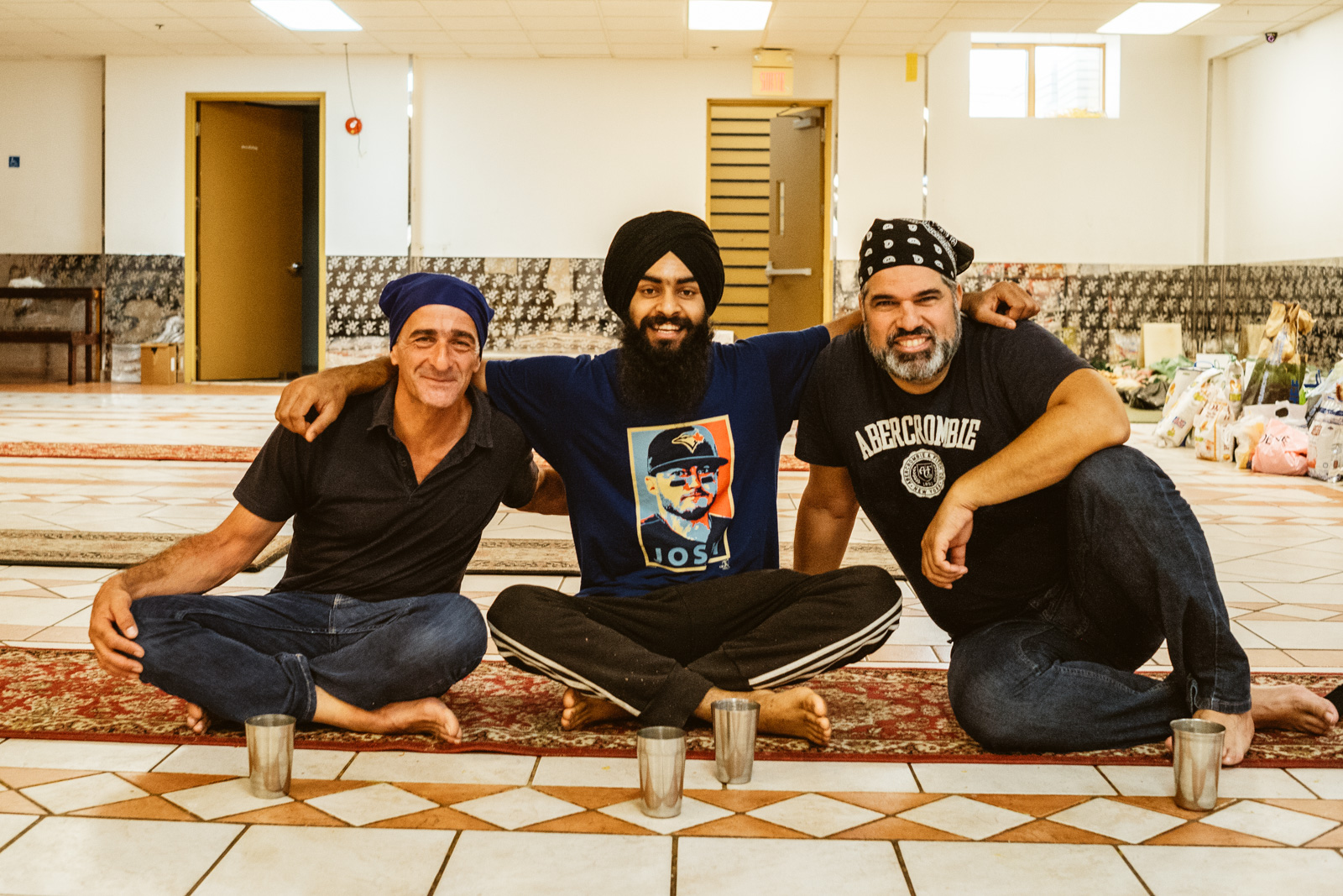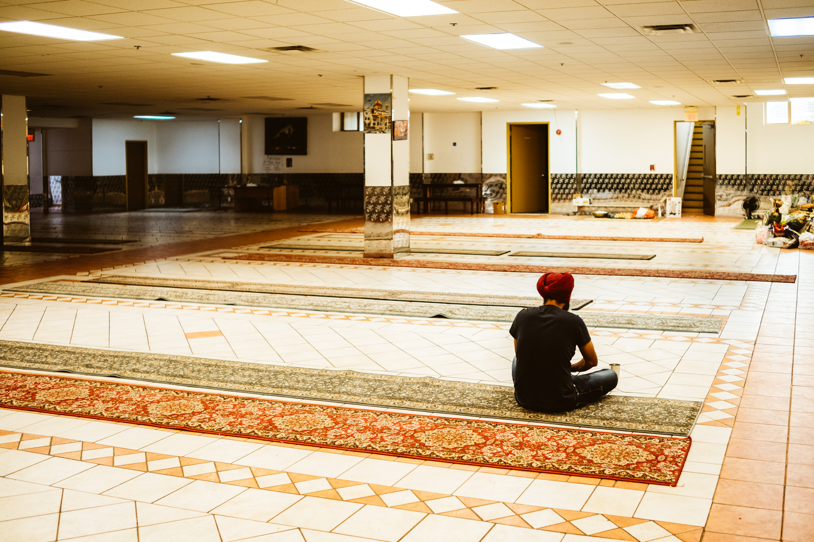 Es war heiss an dem Tag in Montreal, 32 Grad, und normalerweise bekommen mich keine 10 Pferde bei so einem Wetter in eine lange Jeans, der Respekt vor der Kultur und den Sitten allerdings waren dann das 11. Pferd und ich war so happy als wir endlich bei dem Gurduware, so heisst das Haus der Sikh, angekommen waren. Die Schuhe und Socken mussten natürlich ausgezogen werden. Nachdem wir auch unseren Kopf mit einem Tuch bedeckt hatten, mein Kollege hatte mittlerweile seinen Turban angelegt, betraten wir den großen fast leeren Saal.
