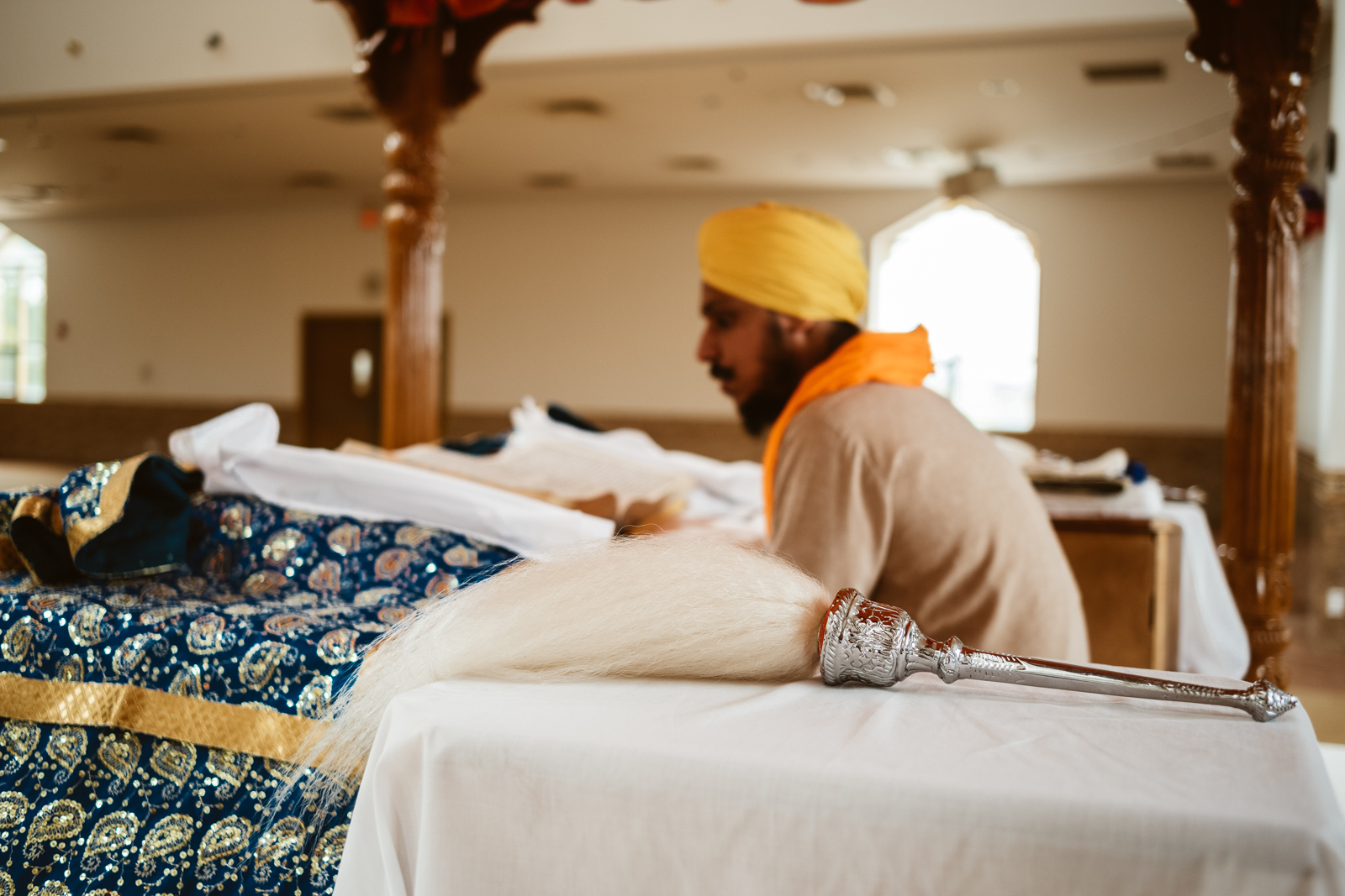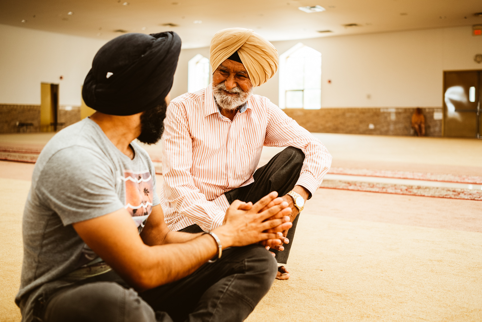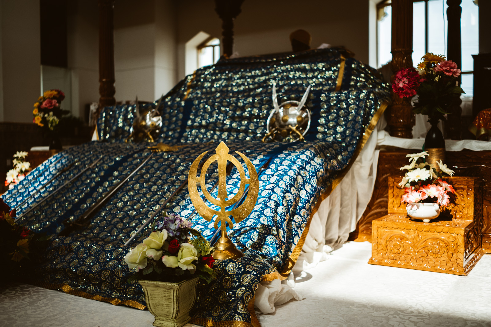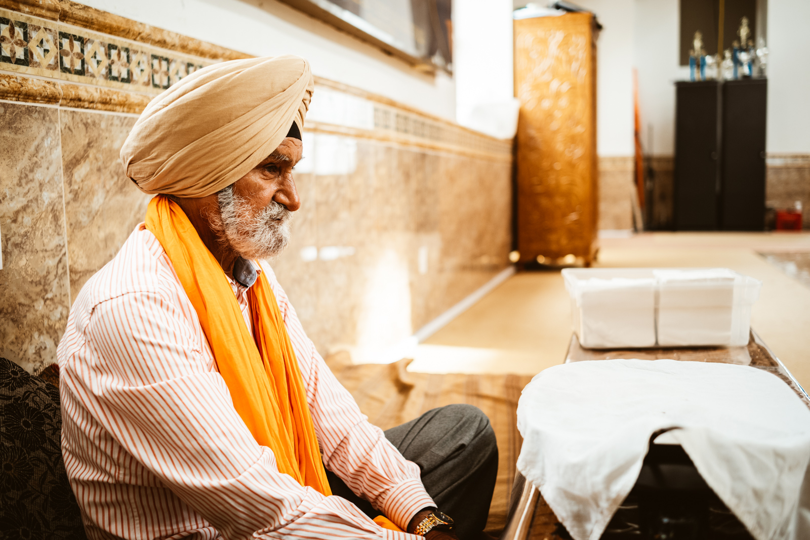 Es war heiss an dem Tag in Montreal, 32 Grad, und normalerweise bekommen mich keine 10 Pferde bei so einem Wetter in eine lange Jeans, der Respekt vor der Kultur und den Sitten allerdings waren dann das 11. Pferd und ich war so happy als wir endlich bei dem Gurduware, so heisst das Haus der Sikh, angekommen waren. Die Schuhe und Socken mussten natürlich ausgezogen werden. Nachdem wir auch unseren Kopf mit einem Tuch bedeckt hatten, mein Kollege hatte mittlerweile seinen Turban angelegt, betraten wir den großen fast leeren Saal.