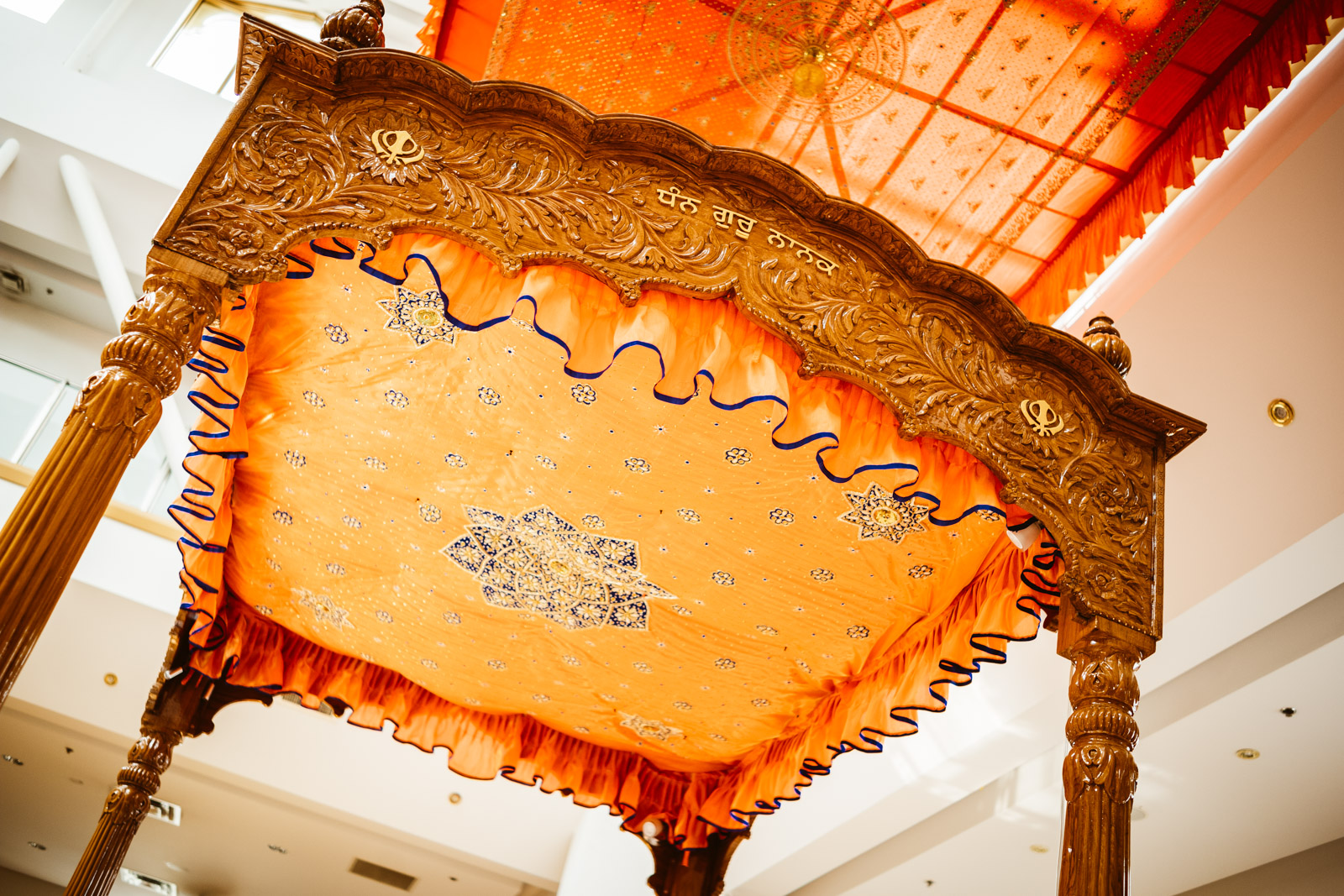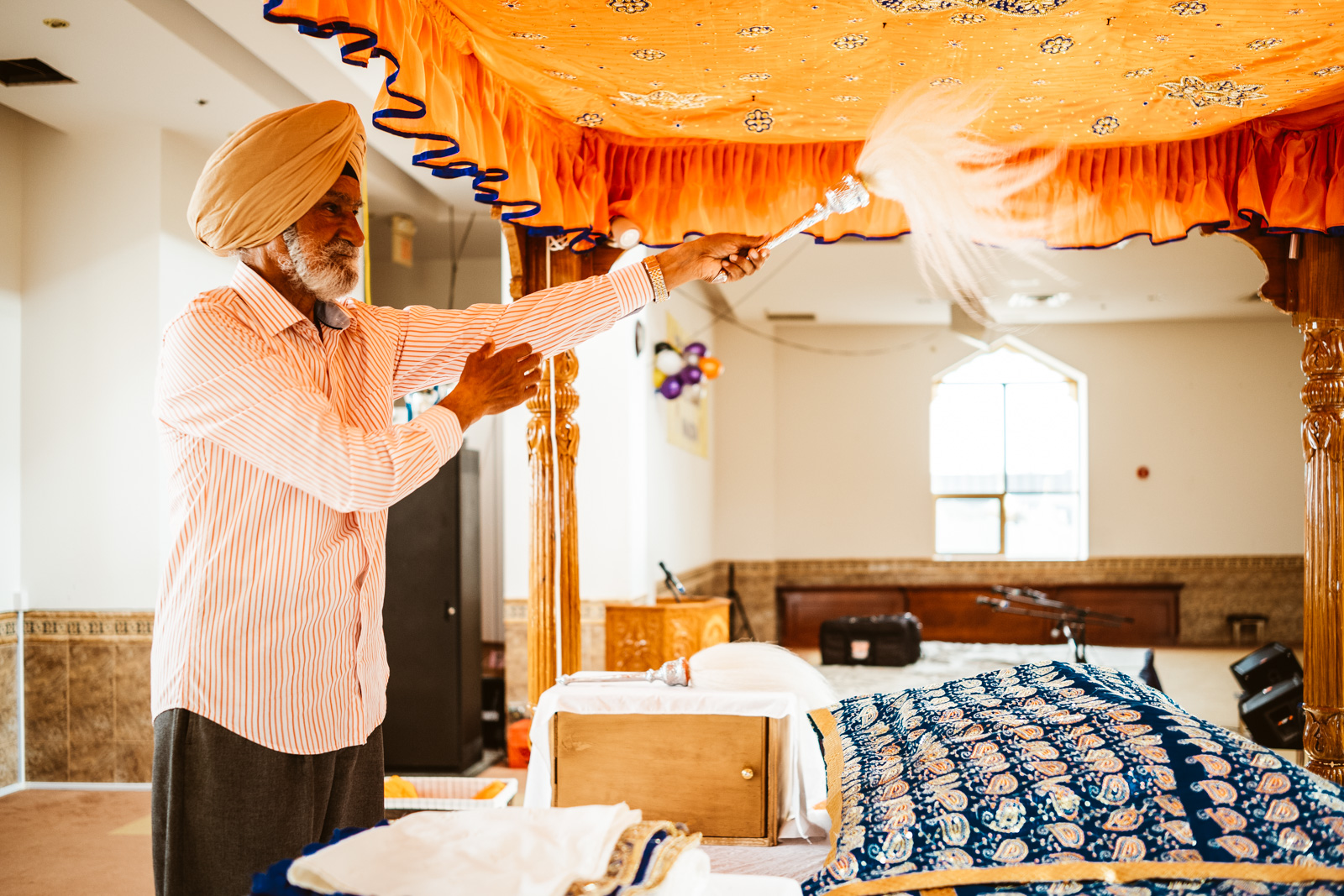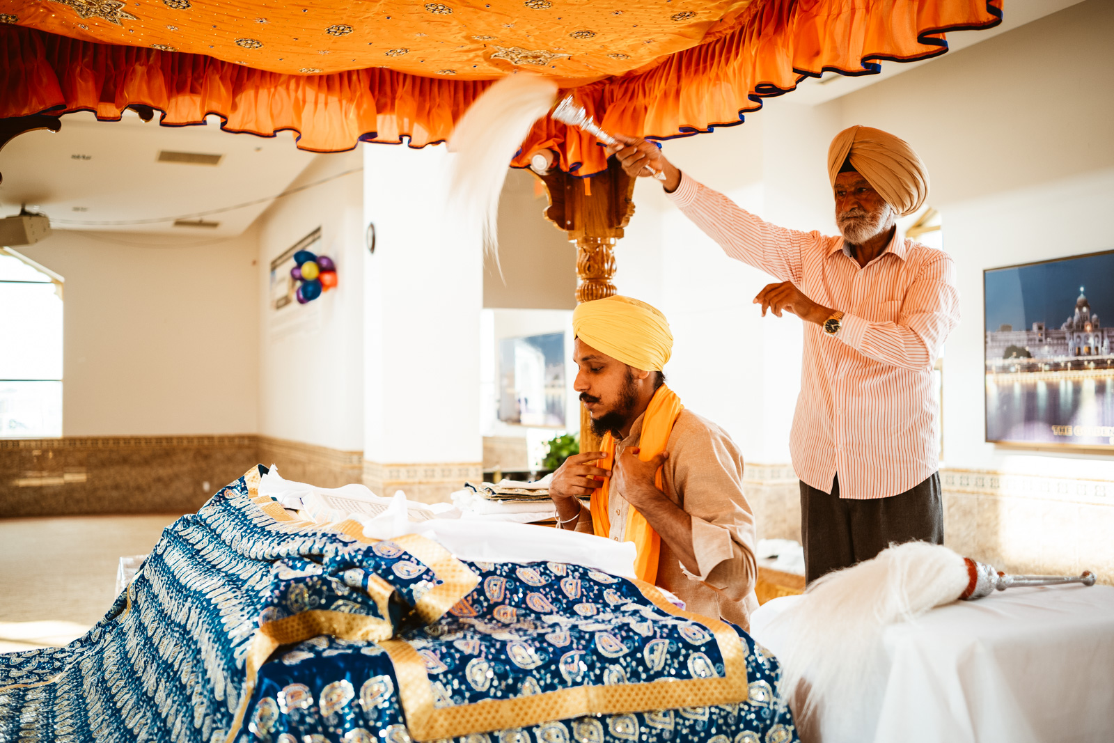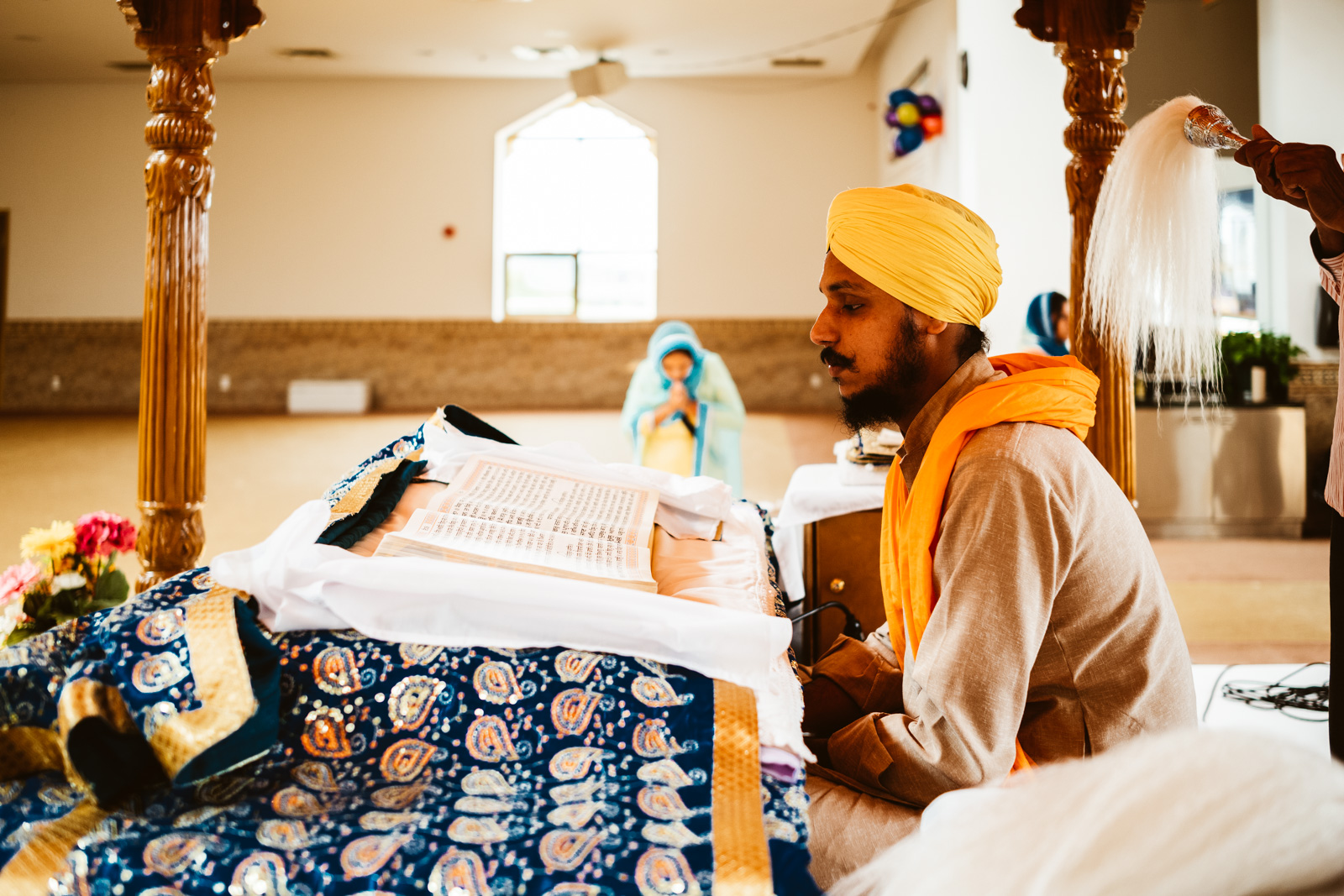Es war heiss an dem Tag in Montreal, 32 Grad, und normalerweise bekommen mich keine 10 Pferde bei so einem Wetter in eine lange Jeans, der Respekt vor der Kultur und den Sitten allerdings waren dann das 11. Pferd und ich war so happy als wir endlich bei dem Gurduware, so heisst das Haus der Sikh, angekommen waren. Die Schuhe und Socken mussten natürlich ausgezogen werden. Nachdem wir auch unseren Kopf mit einem Tuch bedeckt hatten, mein Kollege hatte mittlerweile seinen Turban angelegt, betraten wir den großen fast leeren Saal.