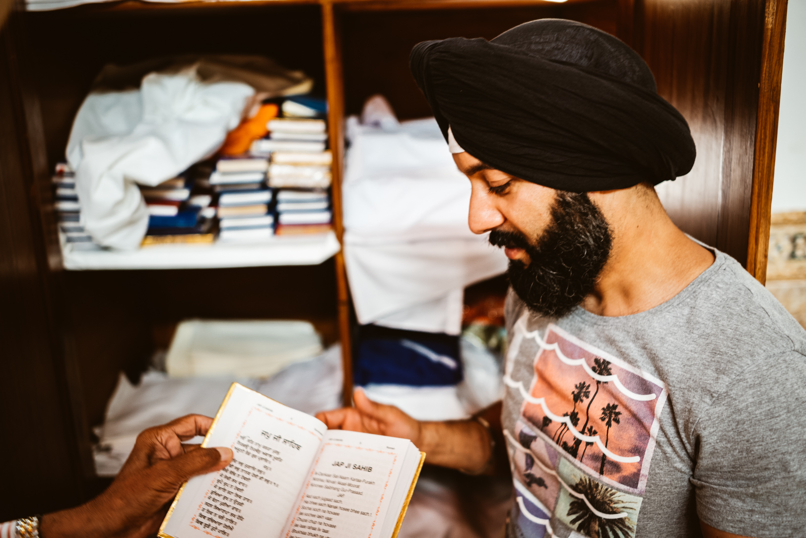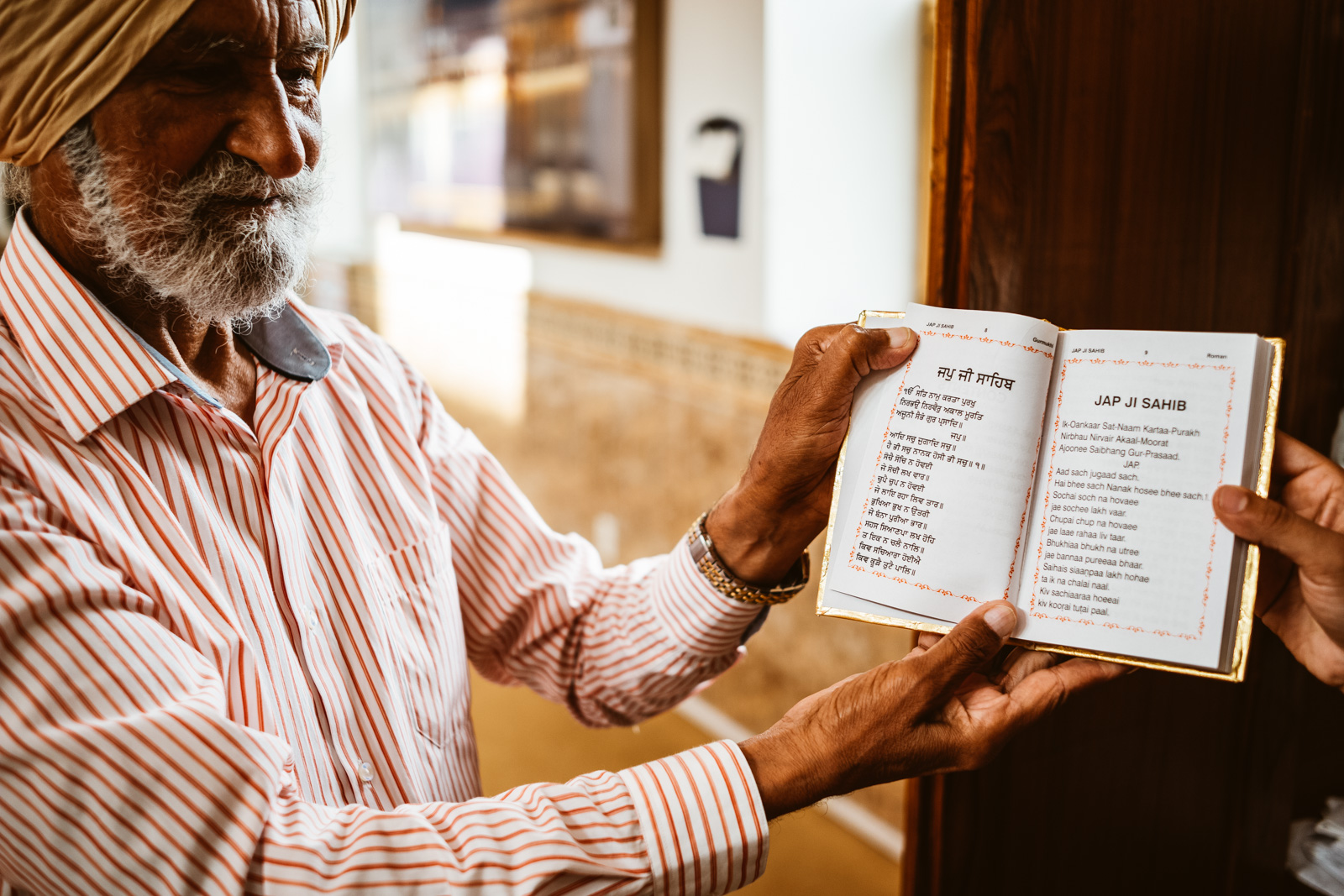 Wir waren recht früh an einem Wochentag da. Es war erwartungsgemäß nicht viel los. Wir zogen recht schnell die Aufmerksamkeit der anderen Anwesenden auf uns. Und ich mit meiner neugierigen Kamera allemal. Uns zur Liebe wurde aus der Guru Granth Sahib vorgelesen. Aus dieser lesen sogenannte Granthi vor, dieser Granthi kann dabei sowohl ein Mann als auch eine Frau sein. Dies gefällt mir eh an dem Sikh Glauben. Es findet keine Unterscheidung zwischen Frau und Mann statt. Die Sikh-Religion betont die Einheit der Schöpfung und verehrt einen gestaltlosen Schöpfergott, der weder Mann noch Frau ist. Das alleine finde ich schon sehr sympathisch, auch dass die Sikh nicht das Kastensystem des Hinduismus haben, finde ich auch sehr sympathisch. Alle sind gleich viel Wert bei den Sikh, selbst andersgläubige werden nicht als minderwertig betrachtet. Zumindest ist das in der Theorie so.