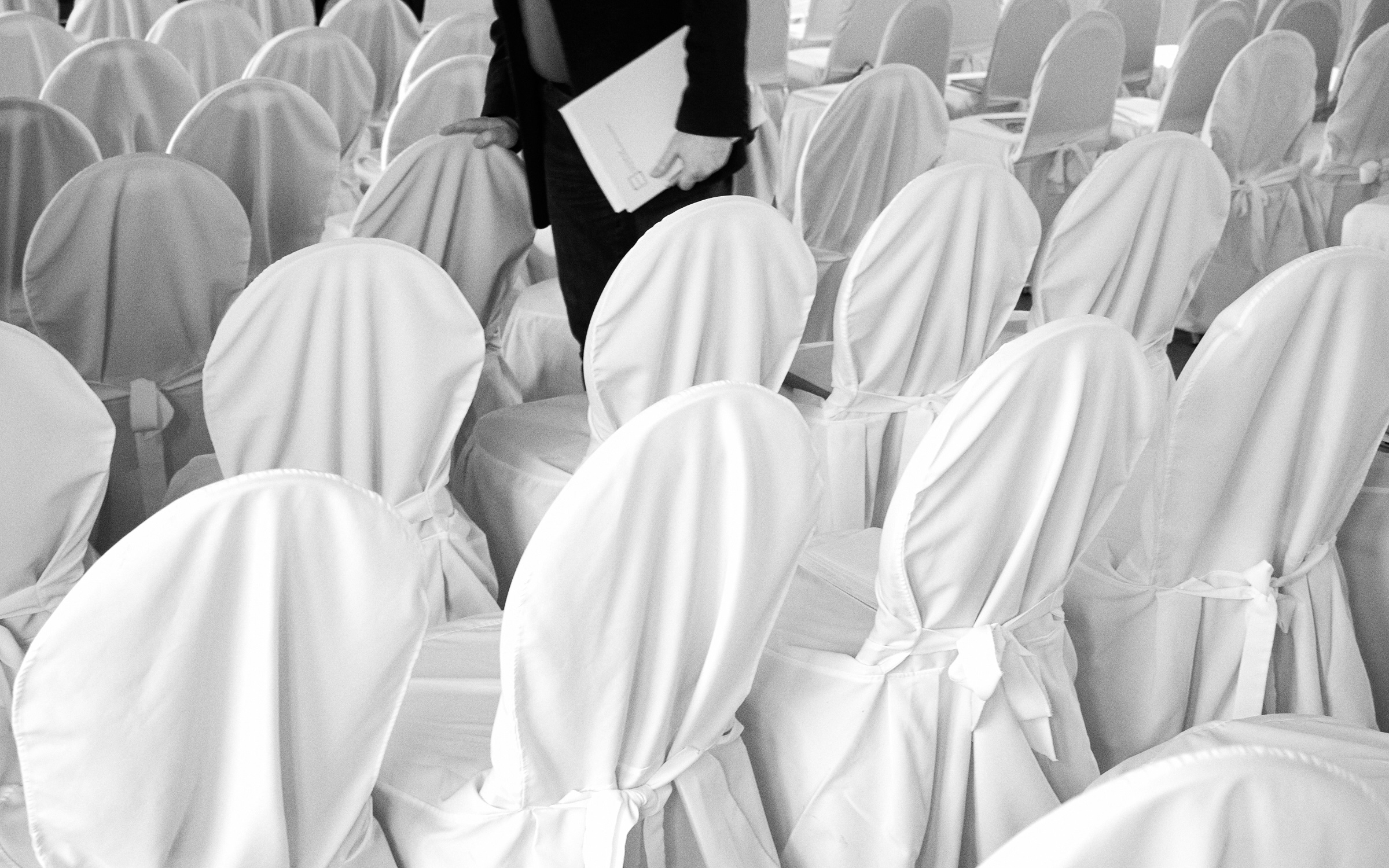 Was sieht man da eigentlich? Ein Mann, zumindest scheint es durch Physis und Kleidung so zu sein, mit Papieren unter dem Arm steht zwischen leeren Stühlen. Letztere sind durch Hussen abgedeckt – das saubere Weiß scheint auf einen offiziellen, vielleicht festlichen Anlass hinzudeuten. Wie viele Stühle es tatsächlich sind, bleibt offen, es scheint „eine ganze Menge“ zu sein. Die Kleidung des Mannes ist ordentlich, aber nicht zu chic, eine Hochzeit scheint es nicht zu sein.