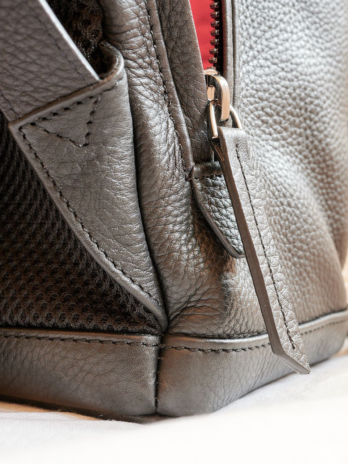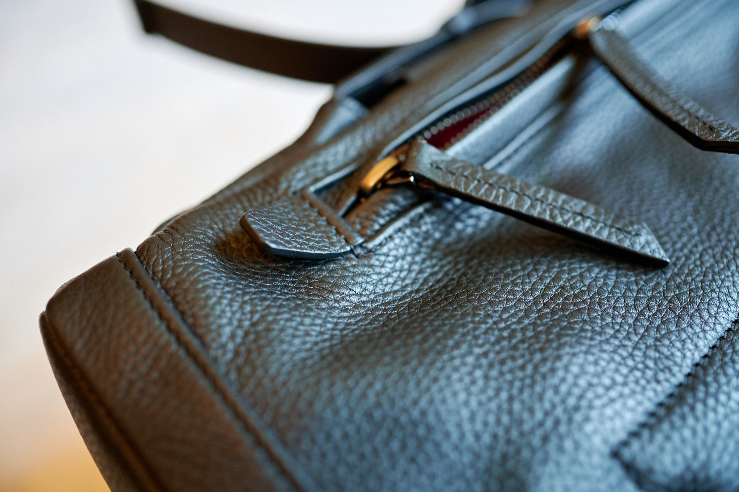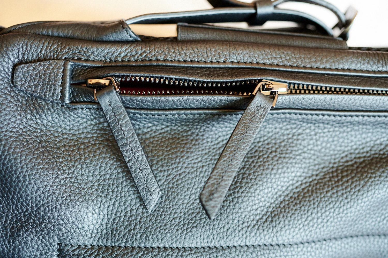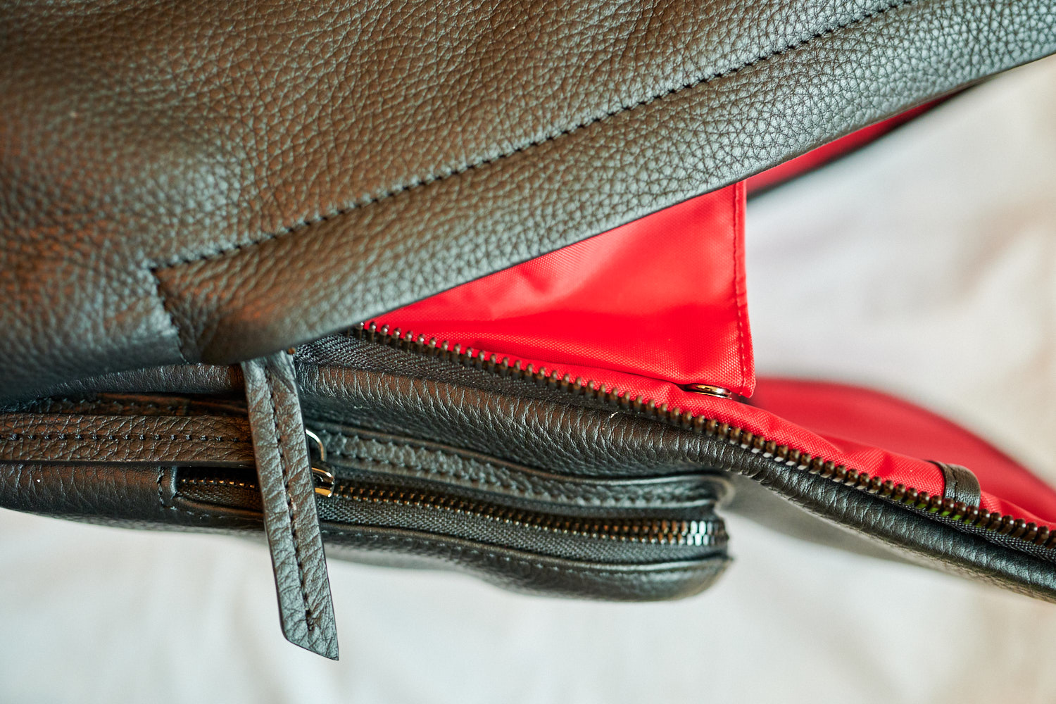 Die Reißverschlüsse sind zum Teil aus Kunststoff, mit Schlitten aus Messing. Die Fähnchen sind wiederum aus Leder außen und Kunststoff innen. Das ist stimmig und greift sich gut. Insgesamt muss ich hier mal was loben: Selten so gute Verarbeitung rings um die Reißverschlüsse gesehen. Die Reißverschlussabdeckungsleisten (Galgenrätsel!) sind perfekt dimensioniert. Es war mir nicht möglich, einen eingeklemmten Reißverschluss (Reißverschlussabdeckungsleisteneinklemmvorkommnis) zu provozieren. Die Verschlüsse laufen dadurch unglaublich flüssig. Perfekt also? Hmm. Für mich als Anwender ja. Für den gelegentlichen Taschendieb laufen sie auch so flüssig. Muss man wissen. 😉
