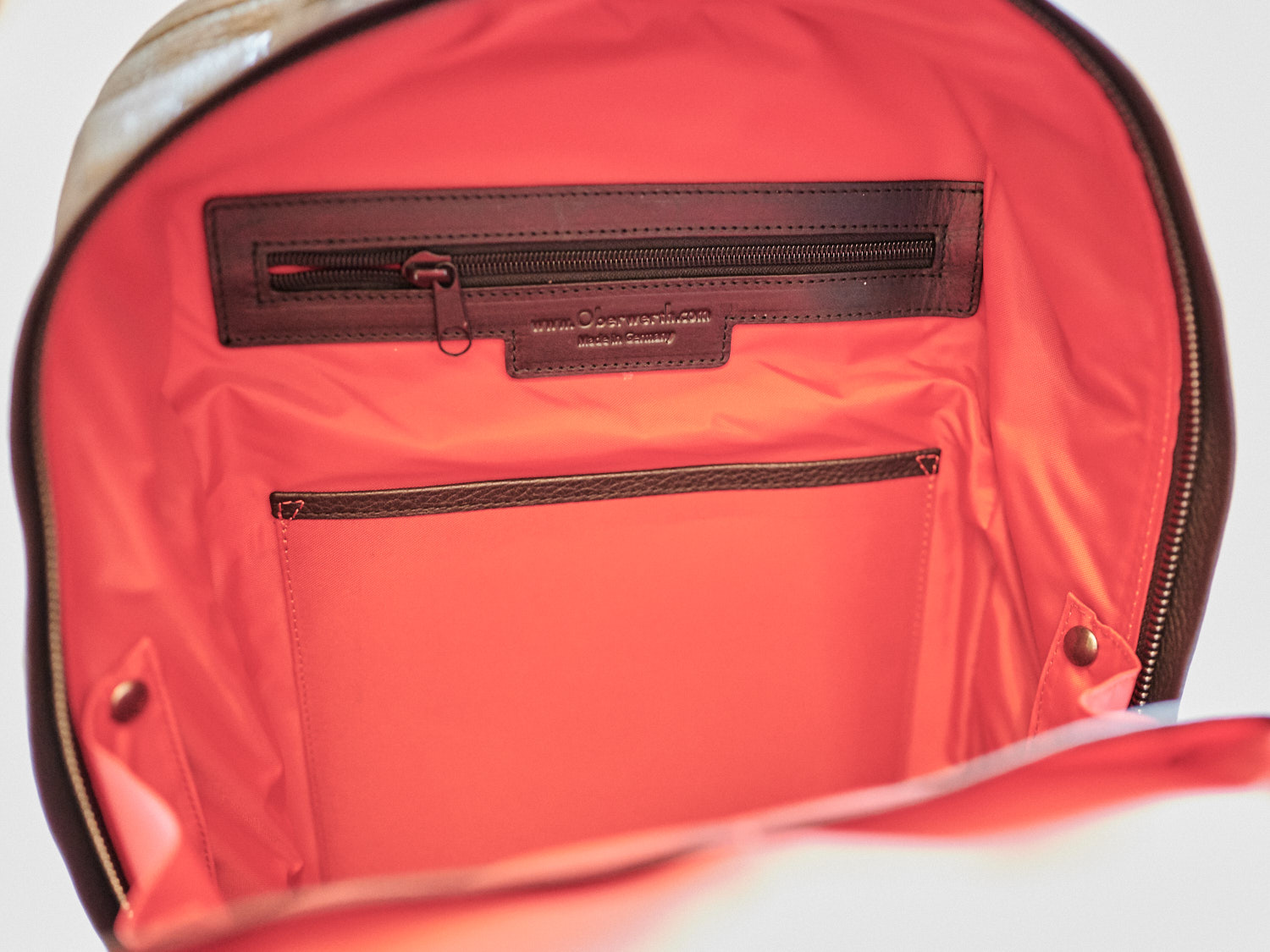 Leder, Messing, Polyester. Der Rucksack besteht aus Rindsleder. Dickem schwarzen Leder. Innen dann findet sich Stoff, der Polyester zu sein scheint. Teilweise glatte Abschnitte in Rot, im Fototeil Kunstfilz, ebenfalls rot. Ich finde das ein wenig gewöhnungsbedürftig, aber es passt ja gut zum Schwarz.