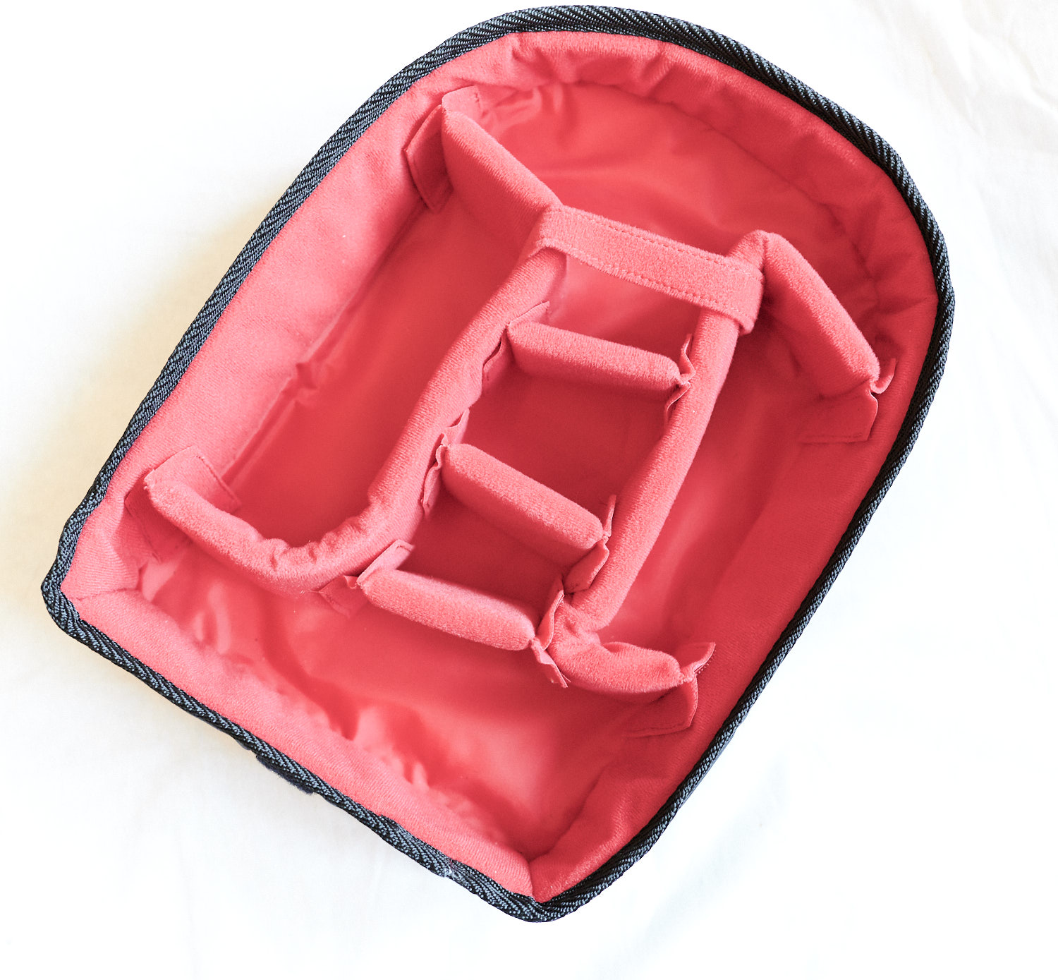 Im Hauptfach ist zunächst erstmal eine Art Fototaschenteil eingearbeitet. Dieses ist oben und unten per Klettverschluss (breit und stabil) befestigt. Das Fototaschenteil ist in sich gestaltbar. Man kann, wie branchenüblich, die einzelnen Abteilungen in Maßen selbst festlegen. Der Gestaltung sind Grenzen gesetzt. Die kleineren Trennstücke greifen per Klettverschluss in den Kunstfilz. Diese Klettis könnten etwas stärker sein.