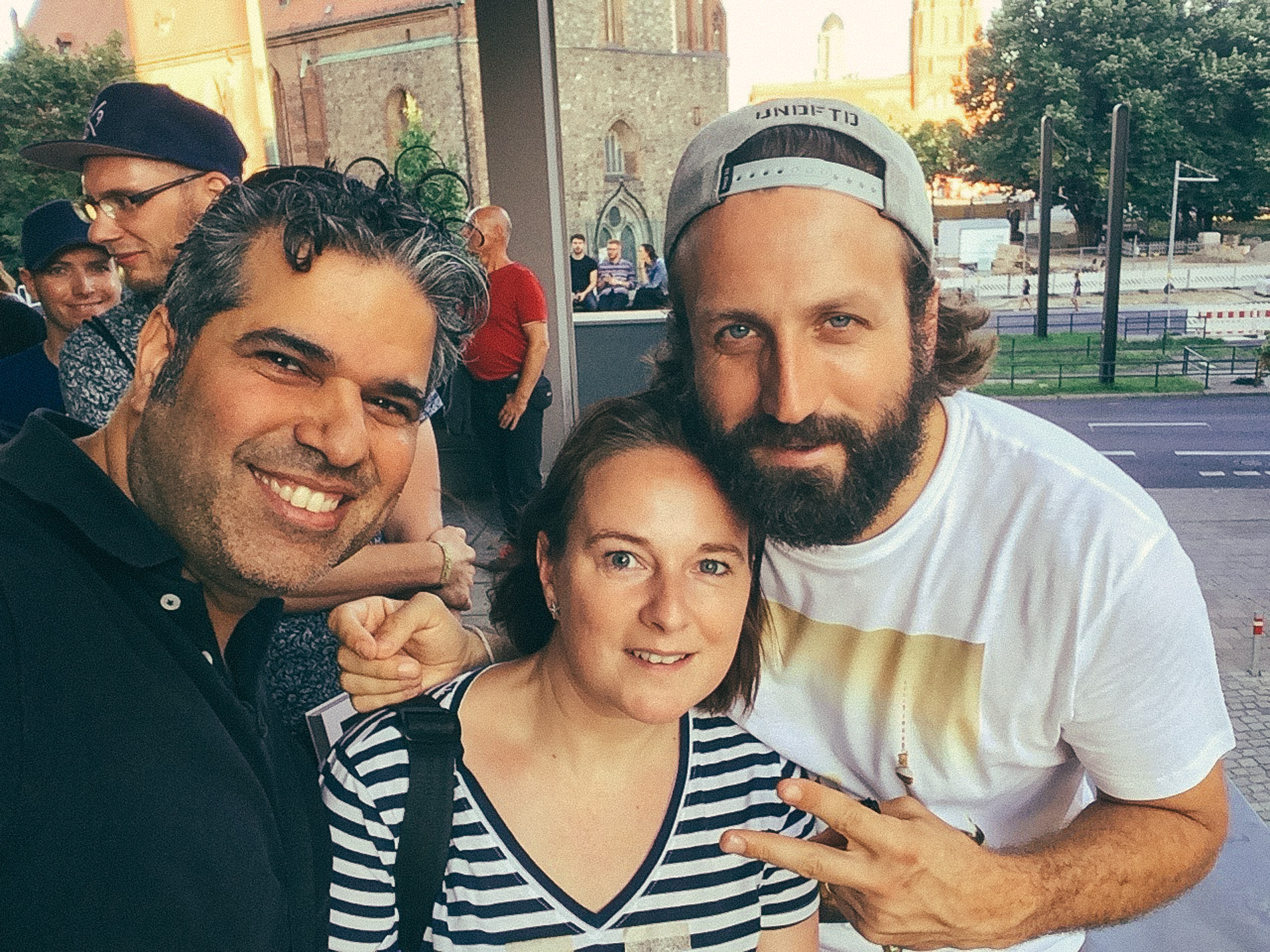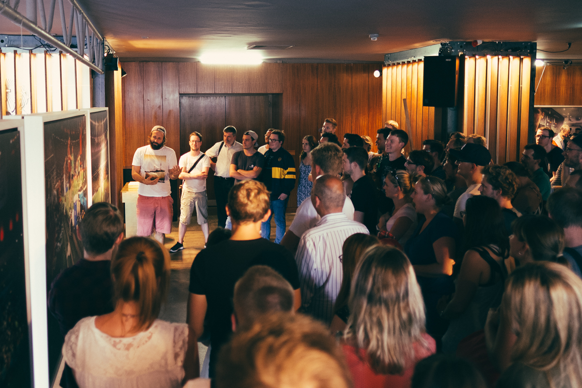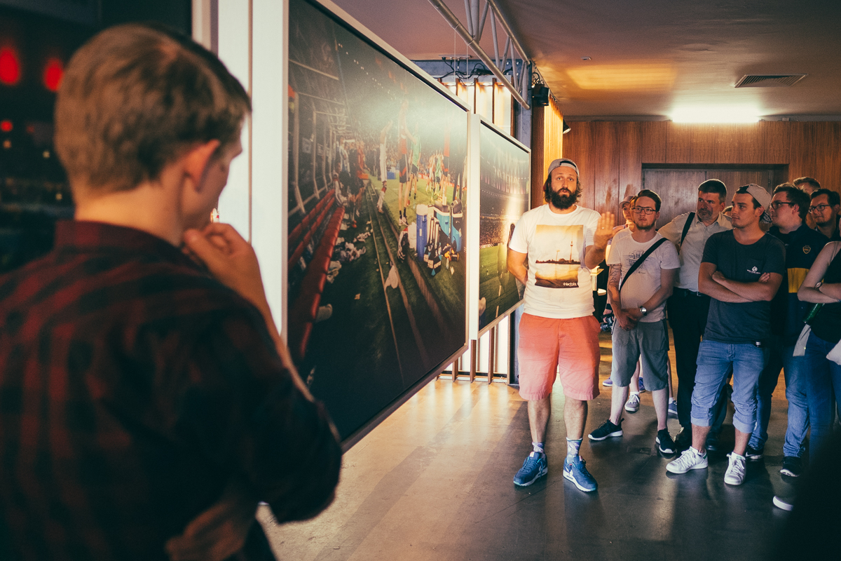 Seit dem 13.07. hat er 27 ausgewählte Bilder aus dieser Nacht in Berlin, Hamburg, München und Köln ausgestellt. Dabei hat er in der Anfangsphase zwei verschiedene Führungen angeboten. Die Nerd-Führung für die Fotografiebegeisterten und die Fan-Führung für die Fußball Fans. Leider konnte ich bei der ersten nicht dabei sein und war deshalb sehr froh, dass er kurzfristig für Berlin eine neue Führung angesetzt hatte. Mir ging es gesundheitlich nicht so dolle und ich hatte gerade anstrengende Arbeitstage hinter mir, aber ich wollte mir diese Führung, eine Mischung aus Nerd- und Fan-Führung, nicht entgehen lassen.