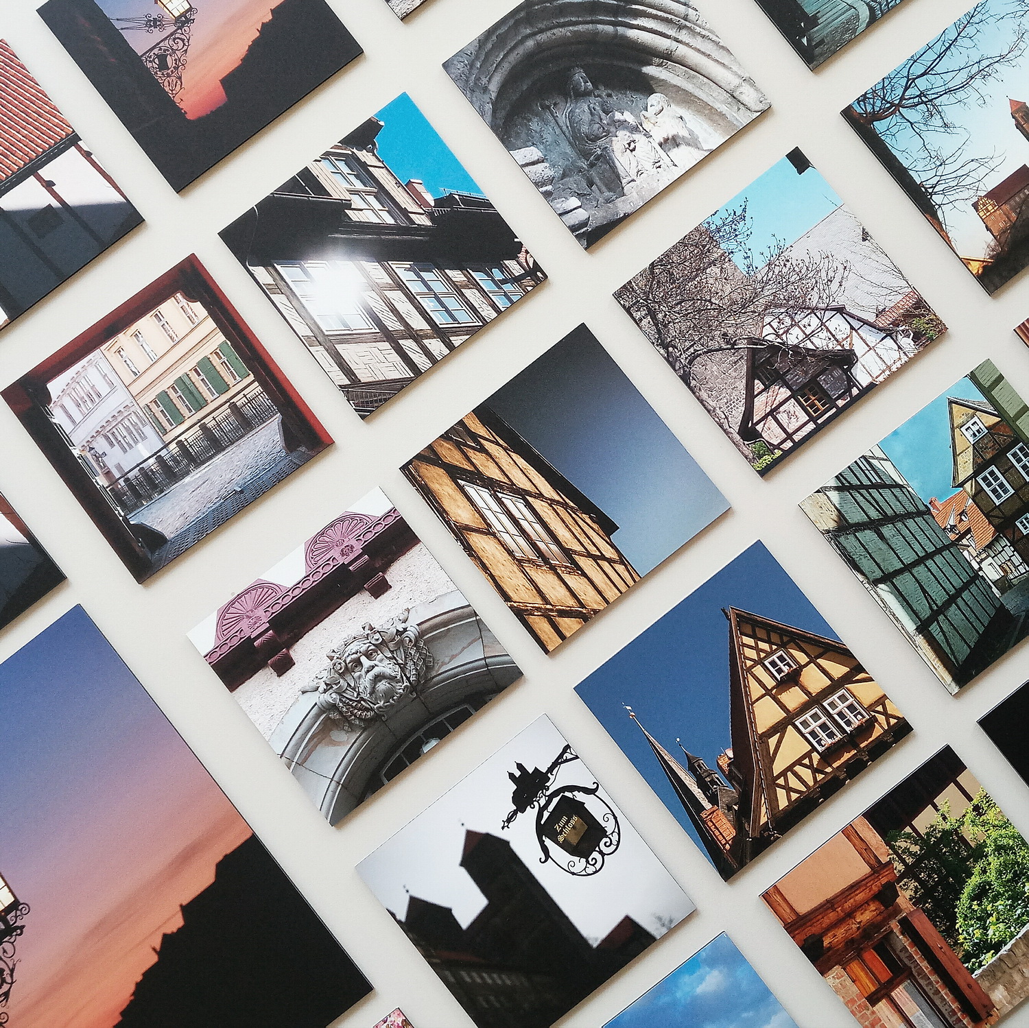 Ich zog also durch die Gassen Quedlinburgs. Hier mal ne Viertelstunde und da mal 20min vor der Arbeit und fotografierte Fachwerk. Da ich mich täglich in dieser Stadt bewege, sind mir natürlich die meisten Ecken bekannt. Ich zog allerdings lieber etwas planlos dahin, wollte was entdecken. Und das klappte auch. Eigentlich wollte ich eine ganze Menge Bilder sammeln und dann irgendwann auf irgendeinem Weg „mal“ publizieren. Wie es der Zufall so wollte, hatte eine Druckfirma gerade ein günstiges Sonderangebot für kleine Alu-Dibond Kacheln – allerdings nur im Quadrat. Und so wagte ich es und sortierte Bilder – die meisten funktionierten nicht im Quadrat und so ging ich auch ins Archiv und knipste manches erneut. Rund 30 Bilder habe ich insgesamt zusammen bekommen und kurzerhand bestellt. Nun hängen sie als kleine (und ja, wirklich kleine) Ausstellung in der Touristeninformation in Quedlinburg.