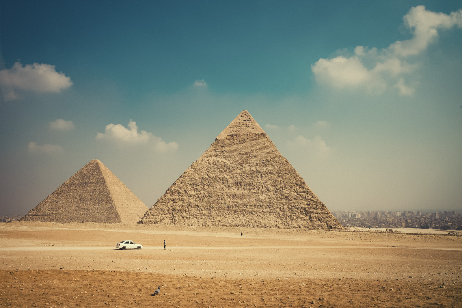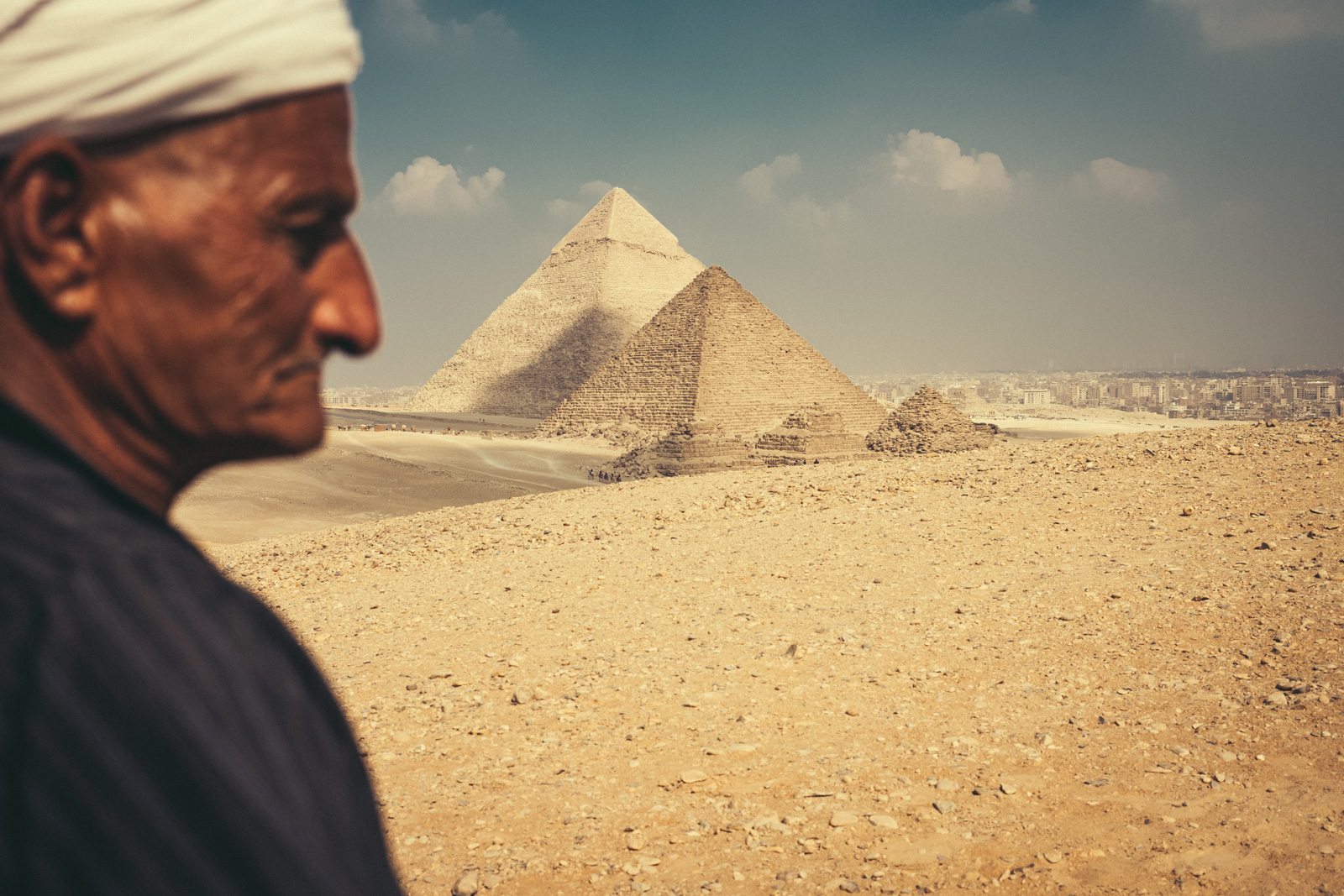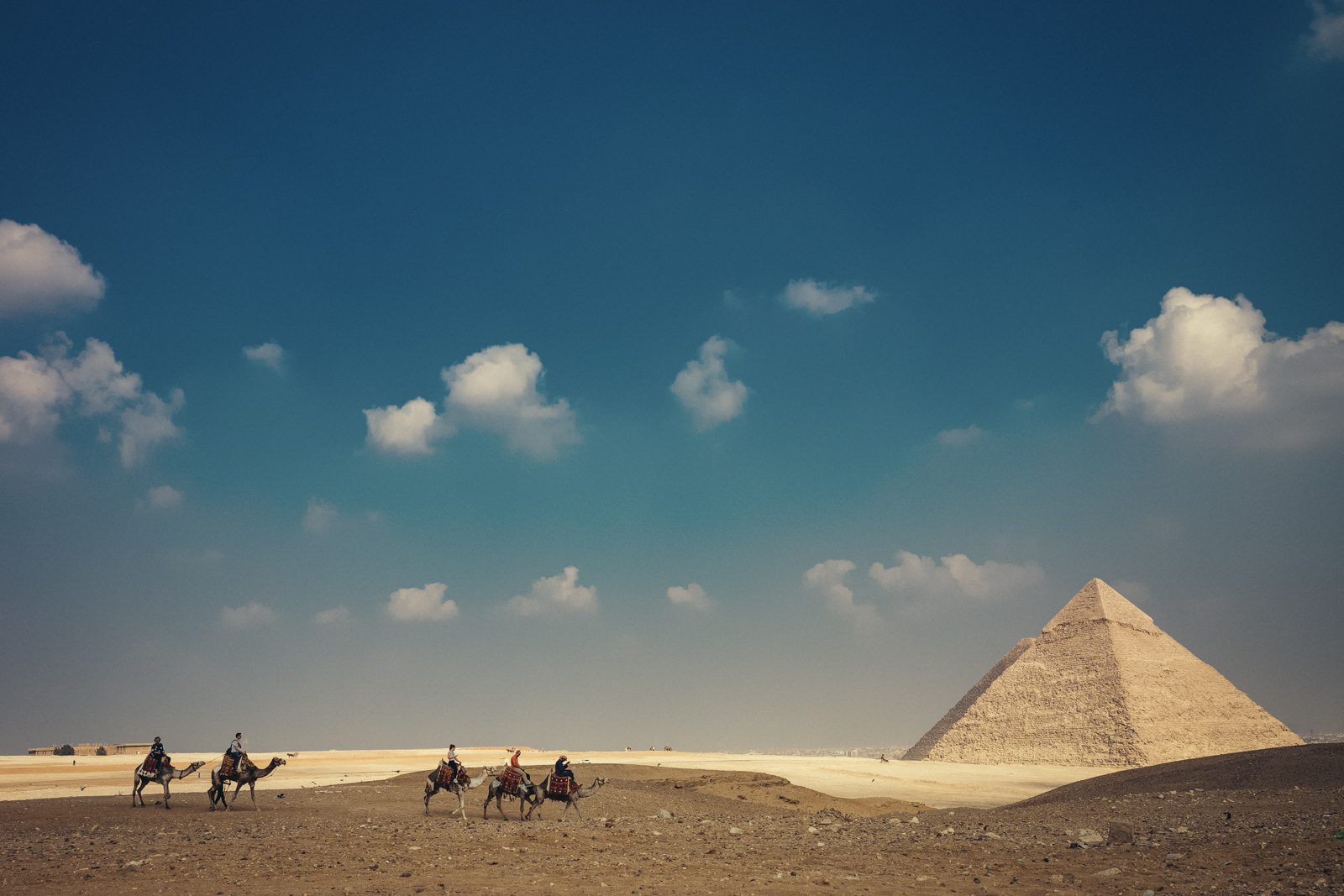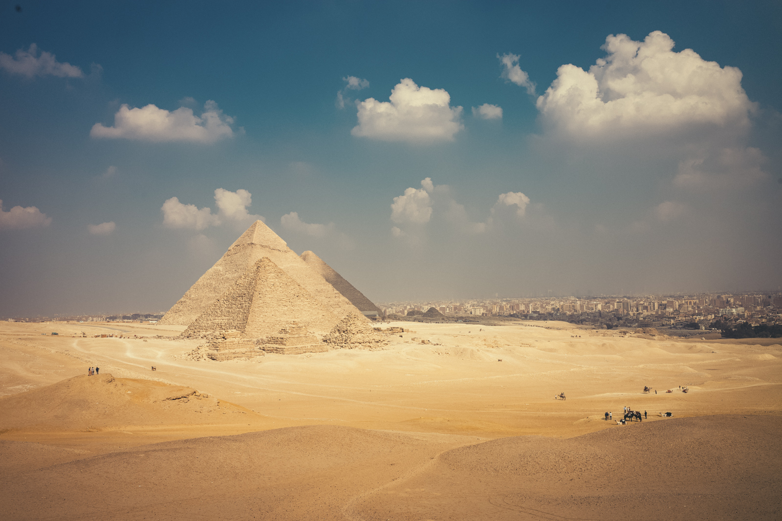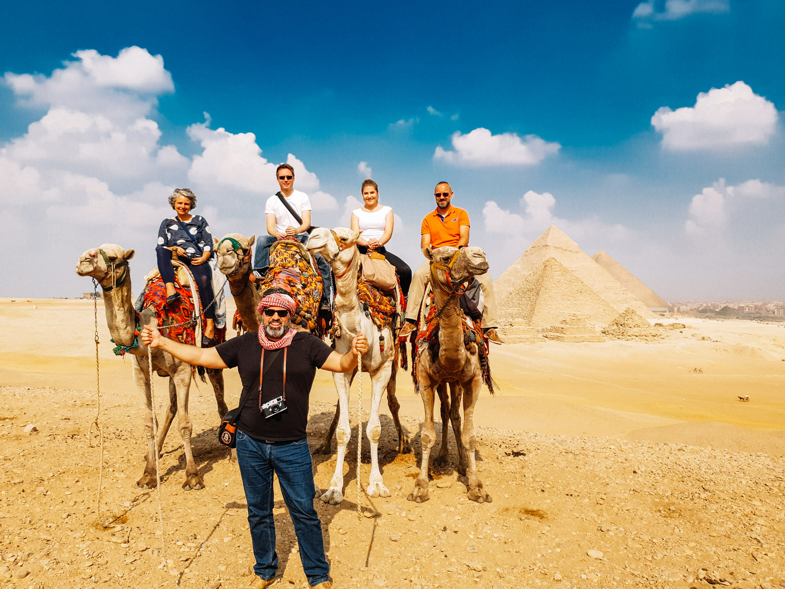 Ich habe ja schon immer eine gewisse Affinität zur Wüste. Ich weiß gar nicht, warum. Schon als Kind wollte ich die Wüste sehen. Eigentlich ja total unspektakulär, aber vielleicht ist es genau das, was mich so fasziniert. Jedenfalls war das Bild mit den Pyramiden, der Wüste und der Stadt Kairo im Hintergrund schon wirklich beeindruckend. Wir hatten Glück, dass so gut wie kein Wind und dadurch sehr schön klare Sicht war.