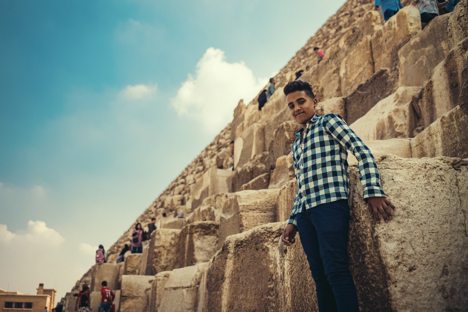 Bis auf ein paar wenige Meter auf vorgegebenem Pfad darf man die Pyramide nicht hinaufklettern. Wirklich interessant ist, dass die alten Ägypter wohl keinen Mörtel oder dergleichen verwendet haben. Ferner ist die Cheops-Pyramide, wie die anderen auch, nicht stufig gewesen, sondern wohl glatt. Sprich, es gab noch eine Verkleidung der Pyramide, die jedoch im Mittelalter fast vollständig abgetragen wurde. Und so steht sie heute im Prinzip nackt da. Man würde vermuten, dass es die Erosion war, die an diesen antiken Bauwerken genagt hat, aber wäre der Raubbau einiger Generationen danach nicht gewesen, dann würden sie vermutlich immer noch wie ursprünglich geplant da stehen.